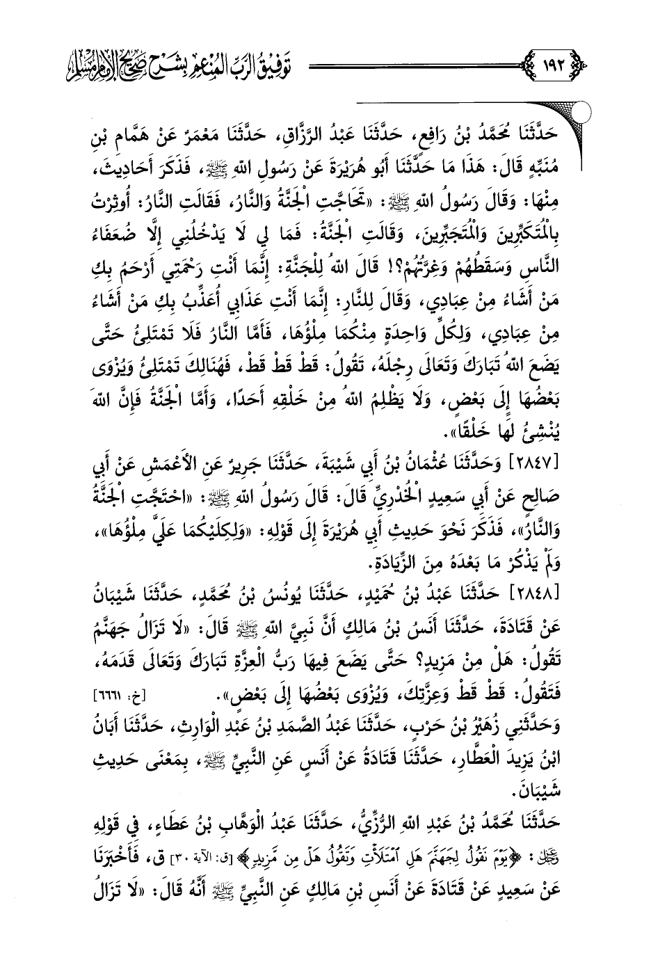 [٢٨٤٨] حَدَّثَنَا عَبْدُ بْنُ حُمَيْدٍ، حَدَّثَنَا يُونُسُ بْنُ مُحَمَّدٍ، حَدَّثَنَا شَيْبَانُ عَنْ قَتَادَةَ، حَدَّثَنَا أَنَسُ بْنُ مَالِكٍ أَنَّ نَبِيَّ اللَّهِ صلى الله عليه وسلم قَالَ: ((لَا تَزَالُ جَهَنَّمُ تَقُولُ: هَلْ مِنْ مَزِيدٍ؟ حَتَّى يَضَعَ فِيهَا رَبُّ الْعِزَّةِ تَبَارَكَ وَتَعَالَى قَدَمَهُ، فَتَقُولُ: قَطْ قَطْ وَعِزَّتِكَ، وَيُزْوَى بَعْضُهَا إِلَى بَعْضٍ)).