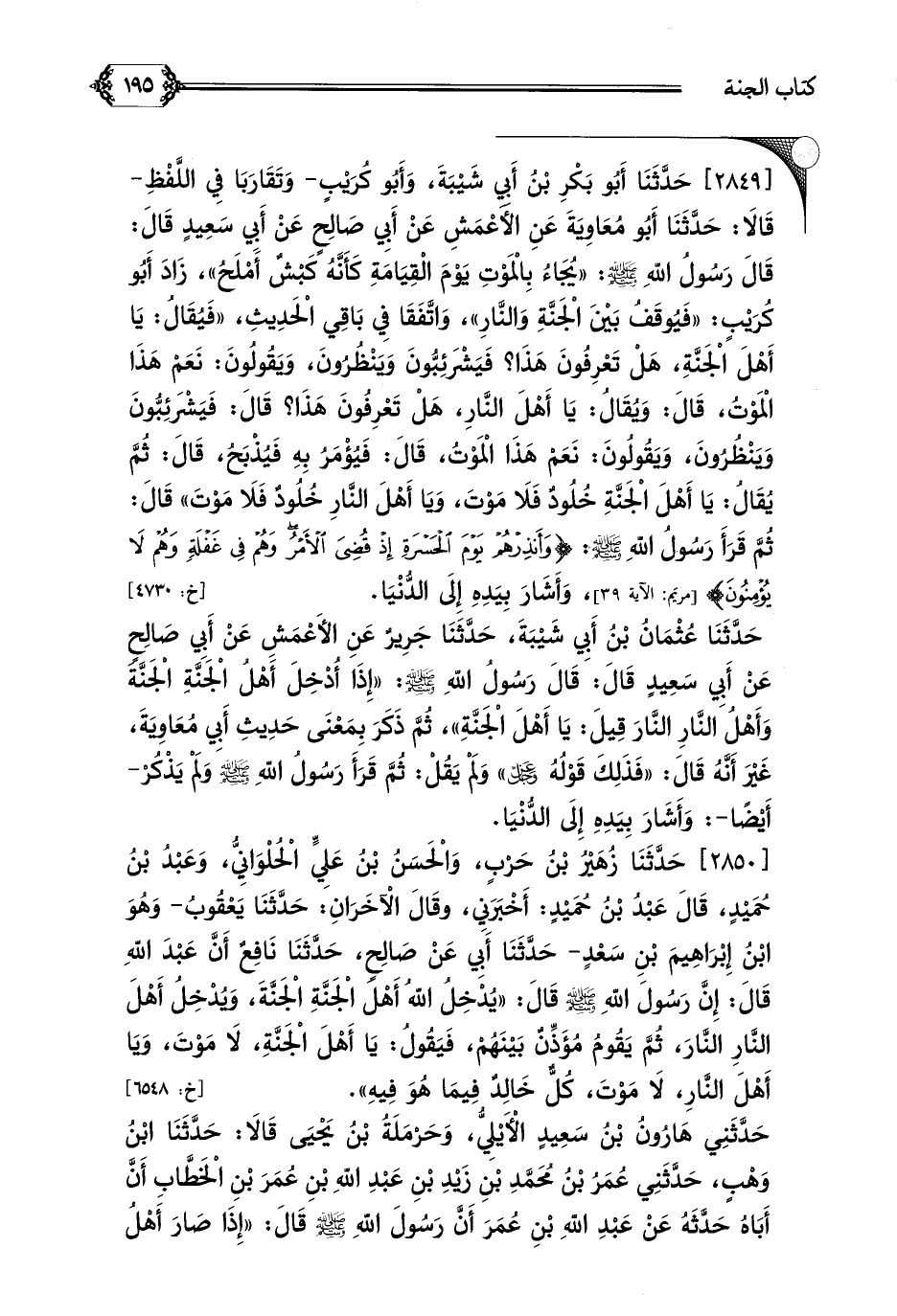 [٢٨٤٩] حَدَّثَنَا أَبُو بَكْرِ بْنُ أَبِي شَيْبَةَ، وَأَبُو كُرَيْبٍ- وَتَقَارَبَا فِي اللَّفْظِ- قَالَا: حَدَّثَنَا أَبُو مُعَاوِيَةَ عَنِ الأَعْمَشِ عَنْ أَبِي صَالِحٍ عَنْ أَبِي سَعِيدٍ قَالَ: قَالَ رَسُولُ اللَّهِ صلى الله عليه وسلم: ((يُجَاءُ بِالْمَوْتِ يَوْمَ الْقِيَامَةِ كَأَنَّهُ كَبْشٌ أَمْلَحُ))، زَادَ أَبُو كُرَيْبٍ: ((فَيُوقَفُ بَيْنَ الْجَنَّةِ وَالنَّارِ))، وَاتَّفَقَا فِي بَاقِي الْحَدِيثِ، ((فَيُقَالُ: يَا أَهْلَ الْجَنَّةِ، هَلْ تَعْرِفُونَ هَذَا؟ فَيَشْرَئِبُّونَ وَيَنْظُرُونَ، وَيَقُولُونَ: نَعَمْ هَذَا الْمَوْتُ، قَالَ: وَيُقَالُ: يَا أَهْلَ النَّارِ، هَلْ تَعْرِفُونَ هَذَا؟ قَالَ: فَيَشْرَئِبُّونَ وَيَنْظُرُونَ، وَيَقُولُونَ: نَعَمْ هَذَا الْمَوْتُ، قَالَ: فَيُؤْمَرُ بِهِ فَيُذْبَحُ، قَالَ: ثُمَّ يُقَالُ: يَا أَهْلَ الْجَنَّةِ خُلُودٌ فَلَا مَوْتَ، وَيَا أَهْلَ النَّارِ خُلُودٌ فَلَا مَوْتَ)) قَالَ: ثُمَّ قَرَأَ رَسُولُ اللَّهِ صلى الله عليه وسلم: {وَأَنْذِرْهُمْ يَوْمَ الْحَسْرَةِ إِذْ قُضِيَ الأَمْرُ وَهُمْ فِي غَفْلَةٍ وَهُمْ لا يُؤْمِنُونَ}، وَأَشَارَ بِيَدِهِ إِلَى الدُّنْيَا.