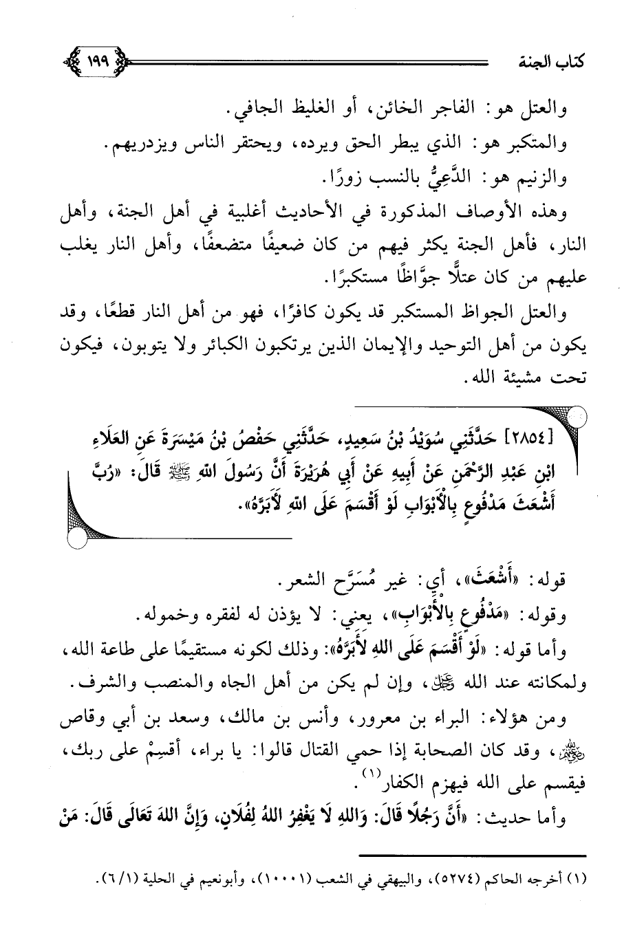 [٢٨٥٤] حَدَّثَنِي سُوَيْدُ بْنُ سَعِيدٍ، حَدَّثَنِي حَفْصُ بْنُ مَيْسَرَةَ عَنِ العَلَاءِ بْنِ عَبْدِ الرَّحْمَنِ عَنْ أَبِيهِ عَنْ أَبِي هُرَيْرَةَ أَنَّ رَسُولَ اللَّهِ صلى الله عليه وسلم قَالَ: ((رُبَّ أَشْعَثَ مَدْفُوعٍ بِالْأَبْوَابِ لَوْ أَقْسَمَ عَلَى اللَّهِ لَأَبَرَّهُ)).