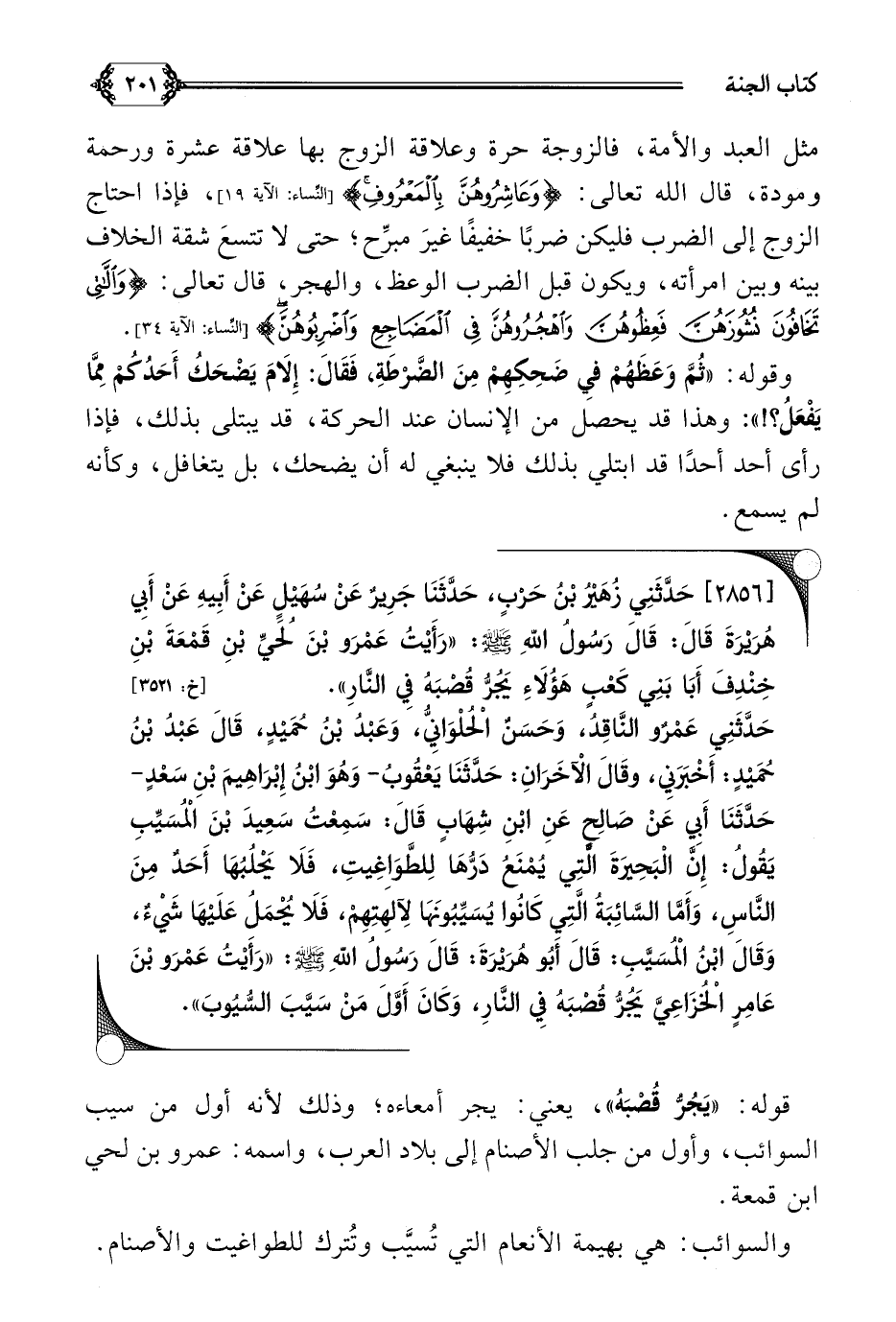 [٢٨٥٦] حَدَّثَنِي زُهَيْرُ بْنُ حَرْبٍ، حَدَّثَنَا جَرِيرٌ عَنْ سُهَيْلٍ عَنْ أَبِيهِ عَنْ أَبِي هُرَيْرَةَ قَالَ: قَالَ رَسُولُ اللَّهِ صلى الله عليه وسلم: ((رَأَيْتُ عَمْرَو بْنَ لُحَيِّ بْنِ قَمْعَةَ بْنِ خِنْدِفَ أَبَا بَنِي كَعْبٍ هَؤُلَاءِ يَجُرُّ قُصْبَهُ فِي النَّارِ)).