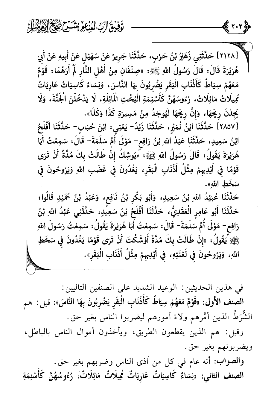 [٢١٢٨] حَدَّثَنِي زُهَيْرُ بْنُ حَرْبٍ، حَدَّثَنَا جَرِيرٌ عَنْ سُهَيْلٍ عَنْ أَبِيهِ عَنْ أَبِي هُرَيْرَةَ قَالَ: قَالَ رَسُولُ اللَّهِ صلى الله عليه وسلم: ((صِنْفَانِ مِنْ أَهْلِ النَّارِ لَمْ أَرَهُمَا: قَوْمٌ مَعَهُمْ سِيَاطٌ كَأَذْنَابِ الْبَقَرِ يَضْرِبُونَ بِهَا النَّاسَ، وَنِسَاءٌ كَاسِيَاتٌ عَارِيَاتٌ مُمِيلَاتٌ مَائِلَاتٌ، رُءُوسُهُنَّ كَأَسْنِمَةِ الْبُخْتِ الْمَائِلَةِ، لَا يَدْخُلْنَ الْجَنَّةَ، وَلَا يَجِدْنَ رِيحَهَا، وَإِنَّ رِيحَهَا لَيُوجَدُ مِنْ مَسِيرَةِ كَذَا وَكَذَا)).