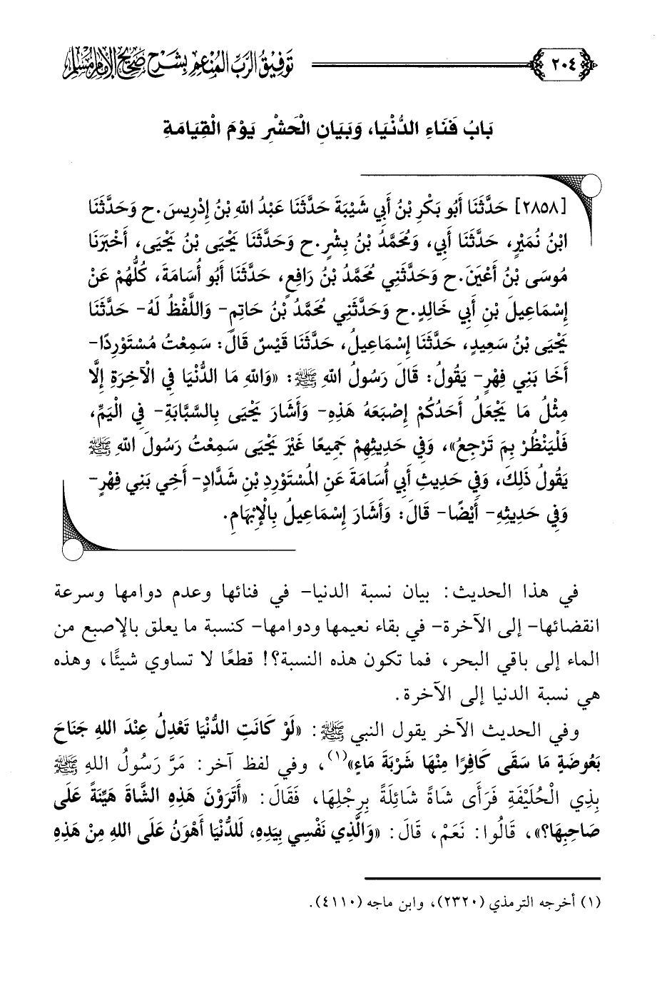 في هذا الحديث: بيان نسبة الدنيا- في فنائها وعدم دوامها وسرعة انقضائها- إلى الآخرة- في بقاء نعيمها ودوامها- كنسبة ما يعلق بالإصبع من الماء إلى باقي البحر، فما تكون هذه النسبة؟ ! قطعًا لا تساوي شيئًا، وهذه هي نسبة الدنيا إلى الآخرة.