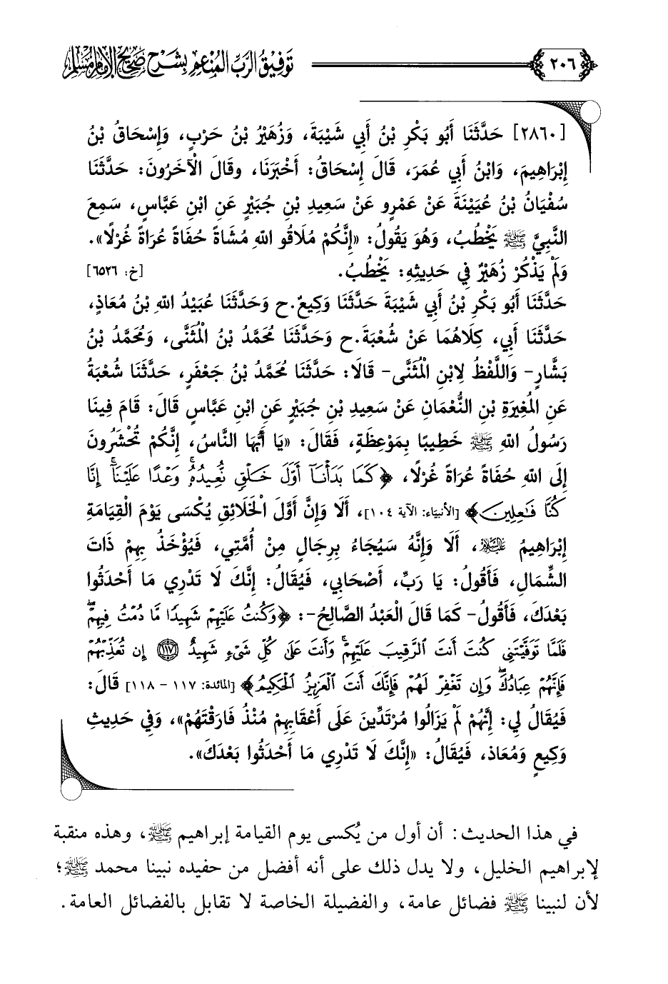حَدَّثَنَا أَبُو بَكْرِ بْنُ أَبِي شَيْبَةَ حَدَّثَنَا وَكِيعٌ. ح وَحَدَّثَنَا عُبَيْدُ اللَّهِ بْنُ مُعَاذٍ، حَدَّثَنَا أَبِي، كِلَاهُمَا عَنْ شُعْبَةَ. ح وَحَدَّثَنَا مُحَمَّدُ بْنُ الْمُثَنَّى، وَمُحَمَّدُ بْنُ بَشَّارٍ- وَاللَّفْظُ لِابْنِ الْمُثَنَّى- قَالَا: حَدَّثَنَا مُحَمَّدُ بْنُ جَعْفَرٍ، حَدَّثَنَا شُعْبَةُ عَنِ المُغِيرَةِ بْنِ النُّعْمَانِ عَنْ سَعِيدِ بْنِ جُبَيْرٍ عَنِ ابْنِ عَبَّاسٍ قَالَ: قَامَ فِينَا رَسُولُ اللَّهِ صلى الله عليه وسلم خَطِيبًا بِمَوْعِظَةٍ، فَقَالَ: ((يَا أَيُّهَا النَّاسُ، إِنَّكُمْ تُحْشَرُونَ إِلَى اللَّهِ حُفَاةً عُرَاةً غُرْلًا، {كَمَا بَدَأْنَا أَوَّلَ خَلْقٍ نُعِيدُهُ وَعْدًا عَلَيْنَا إِنَّا كُنَّا فَاعِلِينَ}، أَلَا وَإِنَّ أَوَّلَ الْخَلَائِقِ يُكْسَى يَوْمَ الْقِيَامَةِ إِبْرَاهِيمُ عَلَيْهِ السَّلَام، أَلَا وَإِنَّهُ سَيُجَاءُ بِرِجَالٍ مِنْ أُمَّتِي، فَيُؤْخَذُ بِهِمْ ذَاتَ الشِّمَالِ، فَأَقُولُ: يَا رَبِّ، أَصْحَابِي، فَيُقَالُ: إِنَّكَ لَا تَدْرِي مَا أَحْدَثُوا بَعْدَكَ، فَأَقُولُ- كَمَا قَالَ الْعَبْدُ الصَّالِحُ-: {وَكُنْتُ عَلَيْهِمْ شَهِيدًا مَا دُمْتُ فِيهِمْ فَلَمَّا تَوَفَّيْتَنِي كُنْتَ أَنْتَ الرَّقِيبَ عَلَيْهِمْ وَأَنْتَ عَلَى كُلِّ شَيْءٍ شَهِيدٌ إِنْ تُعَذِّبْهُمْ فَإِنَّهُمْ عِبَادُكَ وَإِنْ تَغْفِرْ لَهُمْ فَإِنَّكَ أَنْتَ الْعَزِيزُ الْحَكِيمُ} قَالَ: فَيُقَالُ لِي: إِنَّهُمْ لَمْ يَزَالُوا مُرْتَدِّينَ عَلَى أَعْقَابِهِمْ مُنْذُ فَارَقْتَهُمْ))، وَفِي حَدِيثِ وَكِيعٍ وَمُعَاذ، فَيُقَالُ: ((إِنَّكَ لَا تَدْرِي مَا أَحْدَثُوا بَعْدَكَ)).