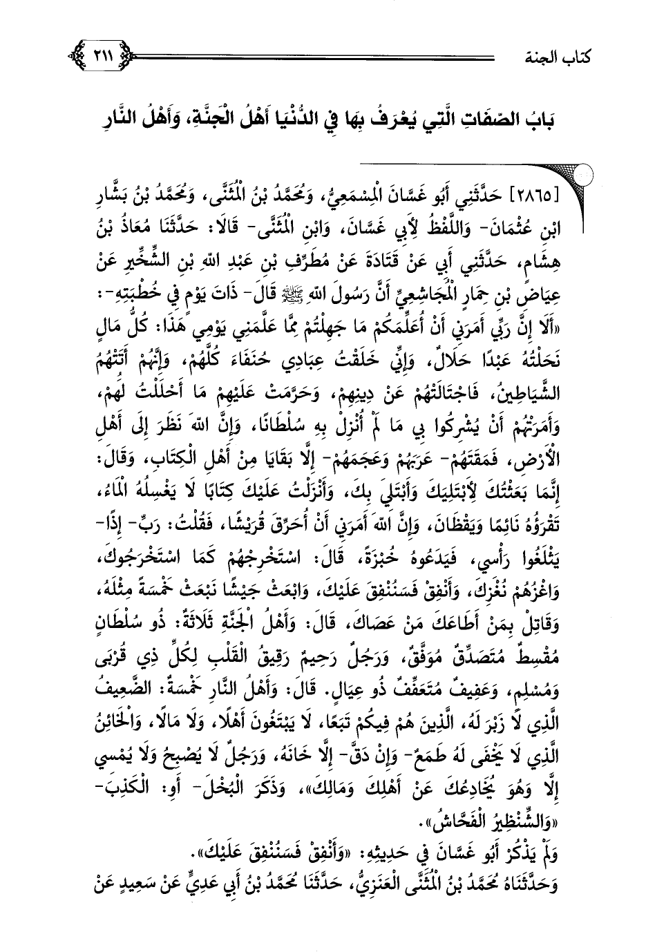 [٢٨٦٥] حَدَّثَنِي أَبُو غَسَّانَ الْمِسْمَعِيُّ، وَمُحَمَّدُ بْنُ الْمُثَنَّى، وَمُحَمَّدُ بْنُ بَشَّارِ بْنِ عُثْمَانَ- وَاللَّفْظُ لِأَبِي غَسَّانَ، وَابْنِ الْمُثَنَّى- قَالَا: حَدَّثَنَا مُعَاذُ بْنُ هِشَامٍ، حَدَّثَنِي أَبِي عَنْ قَتَادَةَ عَنْ مُطَرِّفِ بْنِ عَبْدِ اللَّهِ بْنِ الشِّخِّيرِ عَنْ عِيَاضِ بْنِ حِمَارٍ الْمُجَاشِعِيِّ أَنَّ رَسُولَ اللَّهِ صلى الله عليه وسلم قَالَ- ذَاتَ يَوْمٍ فِي خُطْبَتِهِ-: ((أَلَا إِنَّ رَبِّي أَمَرَنِي أَنْ أُعَلِّمَكُمْ مَا جَهِلْتُمْ مِمَّا عَلَّمَنِي يَوْمِي هَذَا: كُلُّ مَالٍ نَحَلْتُهُ عَبْدًا حَلَالٌ، وَإِنِّي خَلَقْتُ عِبَادِي حُنَفَاءَ كُلَّهُمْ، وَإِنَّهُمْ أَتَتْهُمُ الشَّيَاطِينُ، فَاجْتَالَتْهُمْ عَنْ دِينِهِمْ، وَحَرَّمَتْ عَلَيْهِمْ مَا أَحْلَلْتُ لَهُمْ، وَأَمَرَتْهُمْ أَنْ يُشْرِكُوا بِي مَا لَمْ أُنْزِلْ بِهِ سُلْطَانًا، وَإِنَّ اللَّهَ نَظَرَ إِلَى أَهْلِ الْأَرْضِ، فَمَقَتَهُمْ- عَرَبَهُمْ وَعَجَمَهُمْ- إِلَّا بَقَايَا مِنْ أَهْلِ الْكِتَابِ، وَقَالَ: إِنَّمَا بَعَثْتُكَ لِأَبْتَلِيَكَ وَأَبْتَلِيَ بِكَ، وَأَنْزَلْتُ عَلَيْكَ كِتَابًا لَا يَغْسِلُهُ الْمَاءُ، تَقْرَؤُهُ نَائِمًا وَيَقْظَانَ، وَإِنَّ اللَّهَ أَمَرَنِي أَنْ أُحَرِّقَ قُرَيْشًا، فَقُلْتُ: رَبِّ- إِذًا- يَثْلَغُوا رَأْسِي، فَيَدَعُوهُ خُبْزَةً، قَالَ: اسْتَخْرِجْهُمْ كَمَا اسْتَخْرَجُوكَ، وَاغْزُهُمْ نُغْزِكَ، وَأَنْفِقْ فَسَنُنْفِقَ عَلَيْكَ، وَابْعَثْ جَيْشًا نَبْعَثْ خَمْسَةً مِثْلَهُ، وَقَاتِلْ بِمَنْ أَطَاعَكَ مَنْ عَصَاكَ، قَالَ: وَأَهْلُ الْجَنَّةِ ثَلَاثَةٌ: ذُو سُلْطَانٍ مُقْسِطٌ مُتَصَدِّقٌ مُوَفَّقٌ، وَرَجُلٌ رَحِيمٌ رَقِيقُ الْقَلْبِ لِكُلِّ ذِي قُرْبَى وَمُسْلِمٍ، وَعَفِيفٌ مُتَعَفِّفٌ ذُو عِيَالٍ.