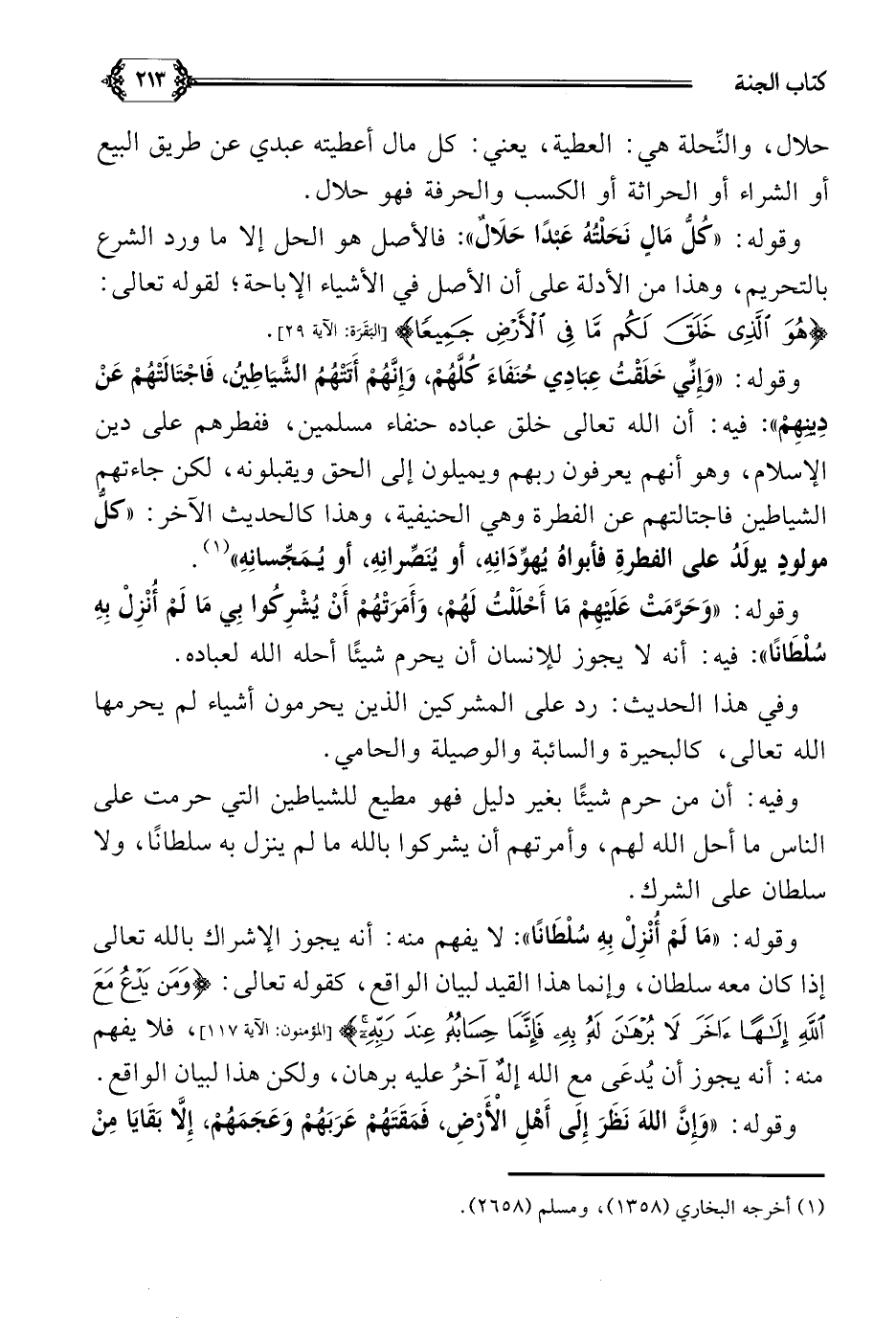 وقوله: ((وَإِنِّي خَلَقْتُ عِبَادِي حُنَفَاءَ كُلَّهُمْ، وَإِنَّهُمْ أَتَتْهُمُ الشَّيَاطِينُ، فَاجْتَالَتْهُمْ عَنْ دِينِهِمْ)): فيه: أن الله تعالى خلق عباده حنفاء مسلمين، ففطرهم على دين الإسلام، وهو أنهم يعرفون ربهم ويميلون إلى الحق ويقبلونه، لكن جاءتهم الشياطين فاجتالتهم عن الفطرة وهي الحنيفية، وهذا كالحديث الآخر: ((كلُّ مولودٍ يولَدُ على الفطرةِ فأبواهُ يُهوِّدَانِهِ، أو يُنَصِّرانِهِ، أو يُمَجِّسانِهِ)) (¬١).