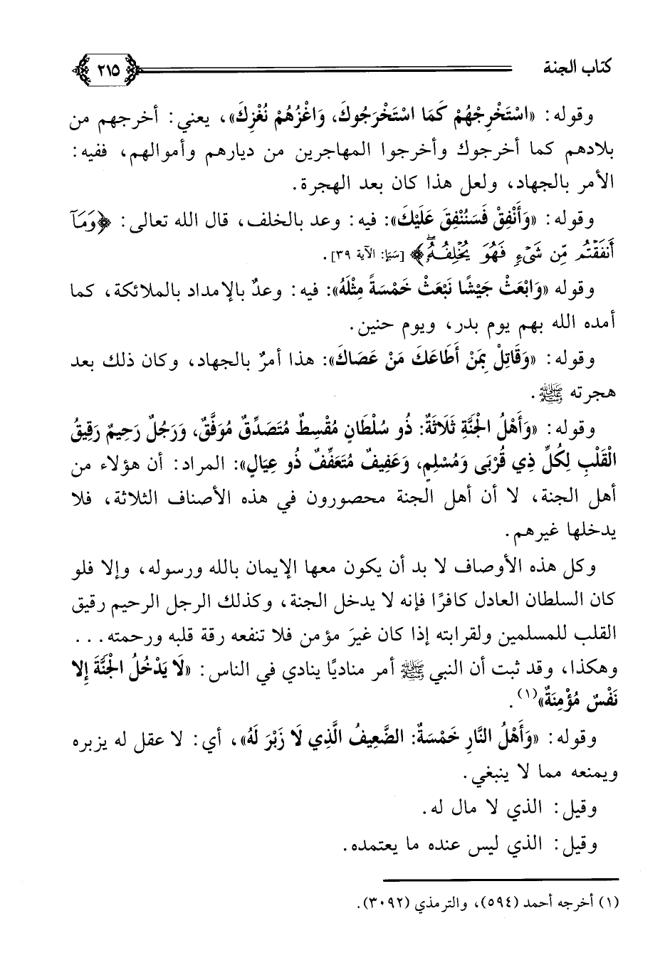 وقوله: ((وَأَهْلُ الْجَنَّةِ ثَلَاثَةٌ: ذُو سُلْطَانٍ مُقْسِطٌ مُتَصَدِّقٌ مُوَفَّقٌ، وَرَجُلٌ رَحِيمٌ رَقِيقُ الْقَلْبِ لِكُلِّ ذِي قُرْبَى وَمُسْلِمٍ، وَعَفِيفٌ مُتَعَفِّفٌ ذُو عِيَالٍ)): المراد: أن هؤلاء من أهل الجنة، لا أن أهل الجنة محصورون في هذه الأصناف الثلاثة، فلا يدخلها غيرهم.
