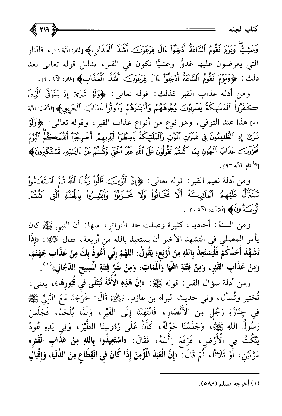 ومن السنة: أحاديث كثيرة وصلت حد التواتر، منها: أن النبي صلى الله عليه وسلم كان يأمر المصلي في التشهد الأخير أن يستعيذ بالله من أربعة، فقال عليه السلام: ((إِذَا تَشَهَّدَ أَحَدُكُمْ فَلْيَسْتَعِذْ بِاللهِ مِنْ أَرْبَعٍ؛ يَقُولُ: اللهُمَّ إِنِّي أَعُوذُ بِكَ مِنْ عَذَابِ جَهَنَّمَ، وَمِنْ عَذَابِ الْقَبْرِ، وَمِنْ فِتْنَةِ الْمَحْيَا وَالْمَمَاتِ، وَمِنْ شَرِّ فِتْنَةِ الْمَسِيحِ الدَّجَّالِ)) (¬١).