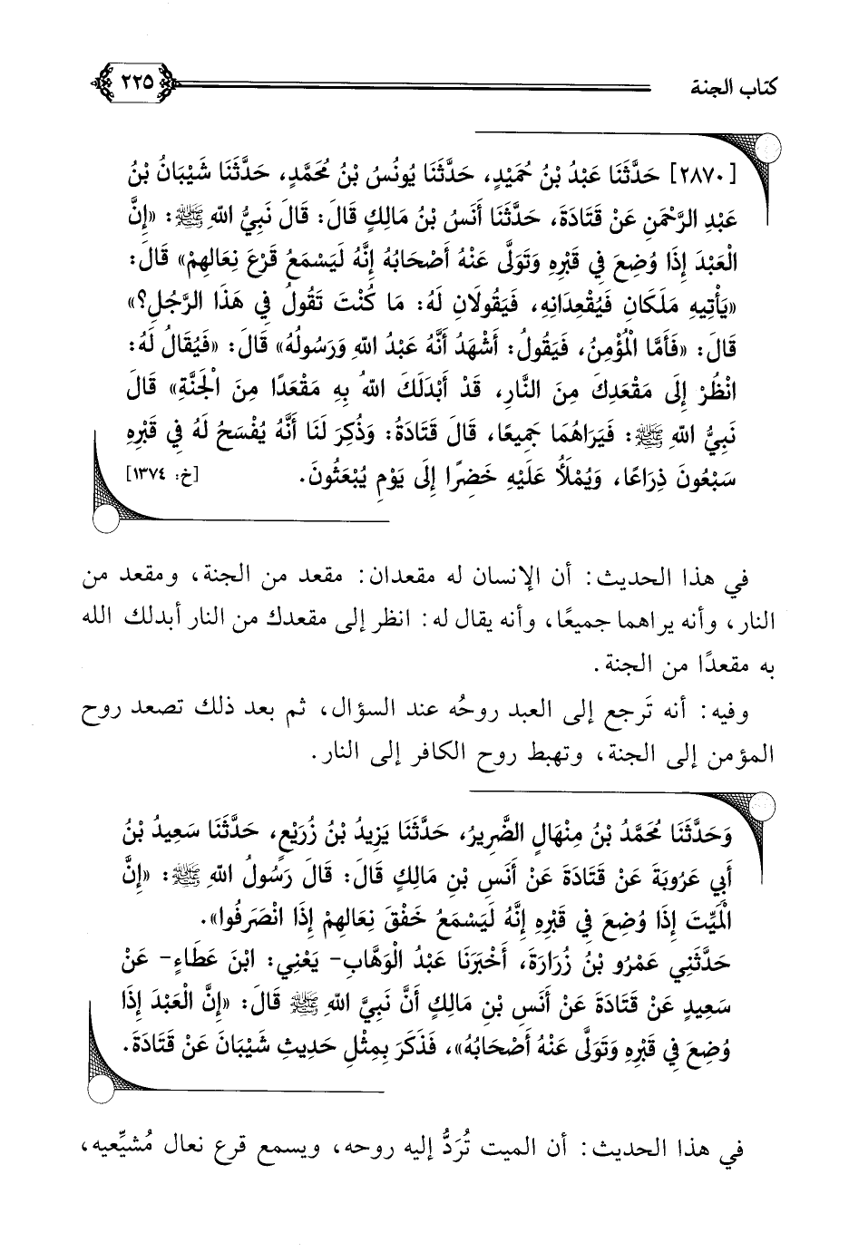 وَحَدَّثَنَا مُحَمَّدُ بْنُ مِنْهَالٍ الضَّرِيرُ، حَدَّثَنَا يَزِيدُ بْنُ زُرَيْعٍ، حَدَّثَنَا سَعِيدُ بْنُ أَبِي عَرُوبَةَ عَنْ قَتَادَةَ عَنْ أَنَسِ بْنِ مَالِكٍ قَالَ: قَالَ رَسُولُ اللَّهِ صلى الله عليه وسلم: ((إِنَّ الْمَيِّتَ إِذَا وُضِعَ فِي قَبْرِهِ إِنَّهُ لَيَسْمَعُ خَفْقَ نِعَالِهِمْ إِذَا انْصَرَفُوا)).