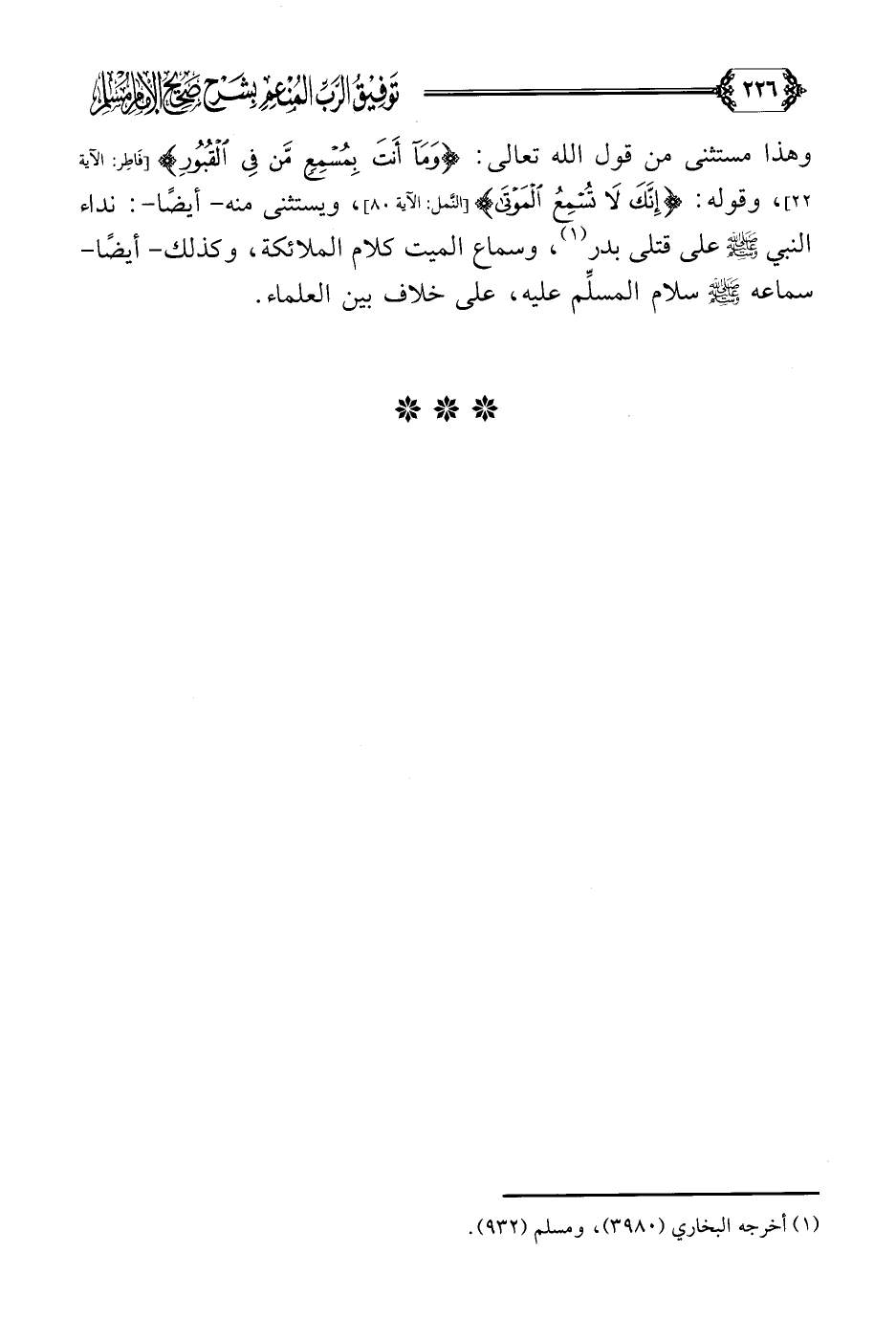 وهذا مستثنى من قول الله تعالى: {وَمَا أَنتَ بِمُسْمِعٍ مَّن فِي الْقُبُورِ}، وقوله: {إِنَّكَ لا تُسْمِعُ الْمَوْتَى}، ويستثنى منه- أيضًا-: نداء النبي صلى الله عليه وسلم على قتلى بدر (¬١)، وسماع الميت كلام الملائكة، وكذلك- أيضًا- سماعه صلى الله عليه وسلم سلام المسلم عليه، على خلاف بين العلماء.