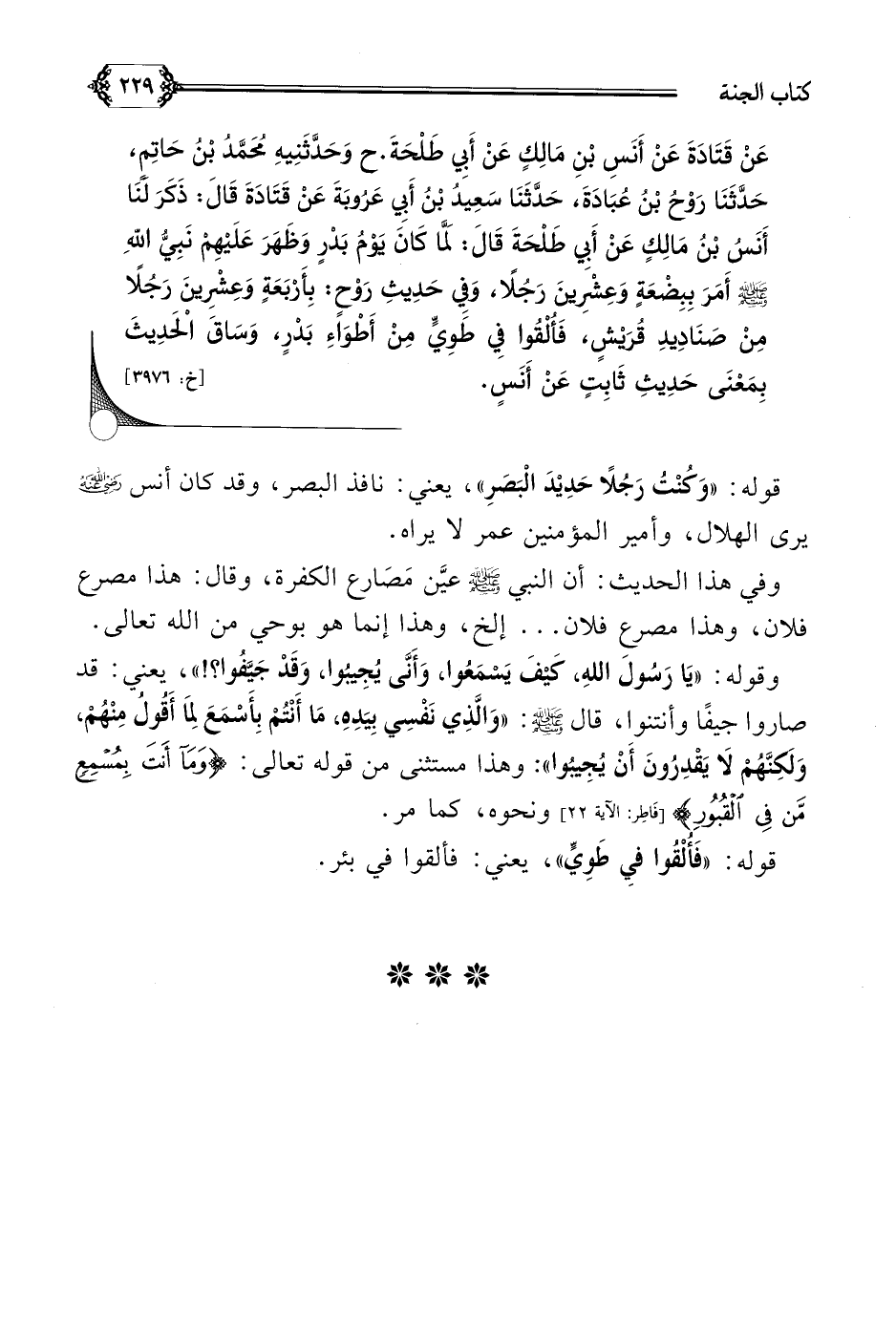 عَنْ قَتَادَةَ عَنْ أَنَسِ بْنِ مَالِكٍ عَنْ أَبِي طَلْحَةَ. ح وَحَدَّثَنِيهِ مُحَمَّدُ بْنُ حَاتِمٍ، حَدَّثَنَا رَوْحُ بْنُ عُبَادَةَ، حَدَّثَنَا سَعِيدُ بْنُ أَبِي عَرُوبَةَ عَنْ قَتَادَةَ قَالَ: ذَكَرَ لَنَا أَنَسُ بْنُ مَالِكٍ عَنْ أَبِي طَلْحَةَ قَالَ: لَمَّا كَانَ يَوْمُ بَدْرٍ وَظَهَرَ عَلَيْهِمْ نَبِيُّ اللَّهِ صلى الله عليه وسلم أَمَرَ بِبِضْعَةٍ وَعِشْرِينَ رَجُلًا، وَفِي حَدِيثِ رَوْحٍ: بِأَرْبَعَةٍ وَعِشْرِينَ رَجُلًا مِنْ صَنَادِيدِ قُرَيْشٍ، فَأُلْقُوا فِي طَوِيٍّ مِنْ أَطْوَاءِ بَدْرٍ، وَسَاقَ الْحَدِيثَ بِمَعْنَى حَدِيثِ ثَابِتٍ عَنْ أَنَسٍ.