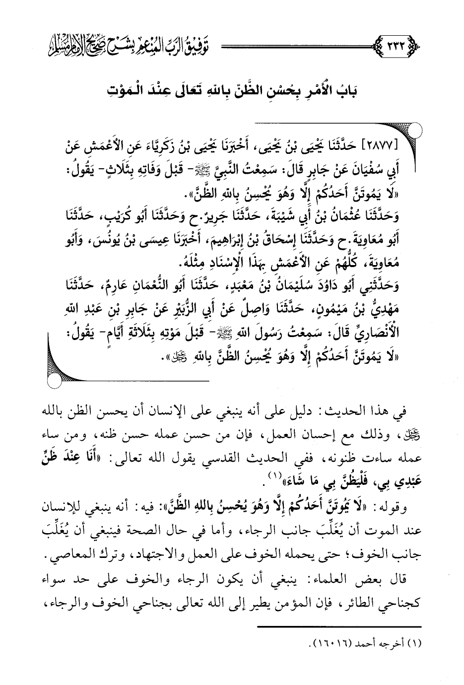 [٢٨٧٧] حَدَّثَنَا يَحْيَى بْنُ يَحْيَى، أَخْبَرَنَا يَحْيَى بْنُ زَكَرِيَّاءَ عَنِ الأَعْمَشِ عَنْ أَبِي سُفْيَانَ عَنْ جَابِرٍ قَالَ: سَمِعْتُ النَّبِيَّ صلى الله عليه وسلم- قَبْلَ وَفَاتِهِ بِثَلَاثٍ- يَقُولُ: ((لَا يَمُوتَنَّ أَحَدُكُمْ إِلَّا وَهُوَ يُحْسِنُ بِاللَّهِ الظَّنَّ)).