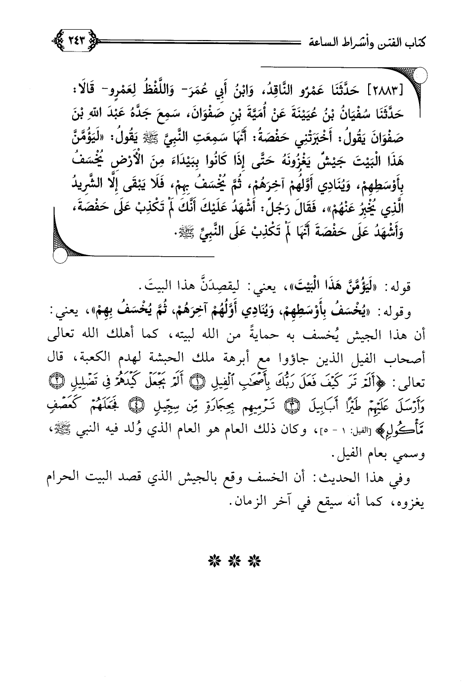 [٢٨٨٣] حَدَّثَنَا عَمْرٌو النَّاقِدُ، وَابْنُ أَبِي عُمَرَ- وَاللَّفْظُ لِعَمْرٍو- قَالَا: حَدَّثَنَا سُفْيَانُ بْنُ عُيَيْنَةَ عَنْ أُمَيَّةَ بْنِ صَفْوَانَ، سَمِعَ جَدَّهُ عَبْدَ اللَّهِ بْنَ صَفْوَانَ يَقُولُ: أَخْبَرَتْنِي حَفْصَةُ: أَنَّهَا سَمِعَتِ النَّبِيَّ صلى الله عليه وسلم يَقُولُ: ((لَيَؤُمَّنَّ هَذَا الْبَيْتَ جَيْشٌ يَغْزُونَهُ حَتَّى إِذَا كَانُوا بِبَيْدَاءَ مِنَ الْأَرْضِ يُخْسَفُ بِأَوْسَطِهِمْ، وَيُنَادِي أَوَّلُهُمْ آخِرَهُمْ، ثُمَّ يُخْسَفُ بِهِمْ، فَلَا يَبْقَى إِلَّا الشَّرِيدُ الَّذِي يُخْبِرُ عَنْهُمْ))، فَقَالَ رَجُلٌ: أَشْهَدُ عَلَيْكَ أَنَّكَ لَمْ تَكْذِبْ عَلَى حَفْصَةَ، وَأَشْهَدُ عَلَى حَفْصَةَ أَنَّهَا لَمْ تَكْذِبْ عَلَى النَّبِيِّ صلى الله عليه وسلم.