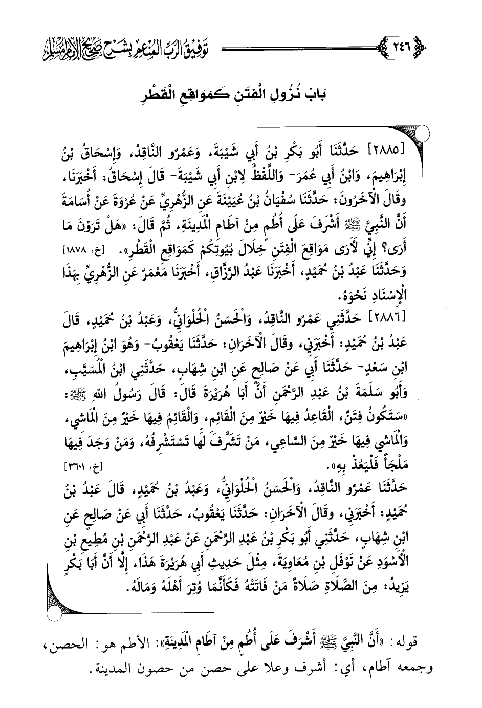 [٢٨٨٥] حَدَّثَنَا أَبُو بَكْرِ بْنُ أَبِي شَيْبَةَ، وَعَمْرٌو النَّاقِدُ، وَإِسْحَاقُ بْنُ إِبْرَاهِيمَ، وَابْنُ أَبِي عُمَرَ- وَاللَّفْظُ لِابْنِ أَبِي شَيْبَةَ- قَالَ إِسْحَاقُ: أَخْبَرَنَا، وقَالَ الْآخَرُونَ: حَدَّثَنَا سُفْيَانُ بْنُ عُيَيْنَةَ عَنِ الزُّهْرِيِّ عَنْ عُرْوَةَ عَنْ أُسَامَةَ أَنَّ النَّبِيَّ صلى الله عليه وسلم أَشْرَفَ عَلَى أُطُمٍ مِنْ آطَامِ الْمَدِينَةِ، ثُمَّ قَالَ: ((هَلْ تَرَوْنَ مَا أَرَى؟ إِنِّي لَأَرَى مَوَاقِعَ الْفِتَنِ خِلَالَ بُيُوتِكُمْ كَمَوَاقِعِ الْقَطْرِ)).