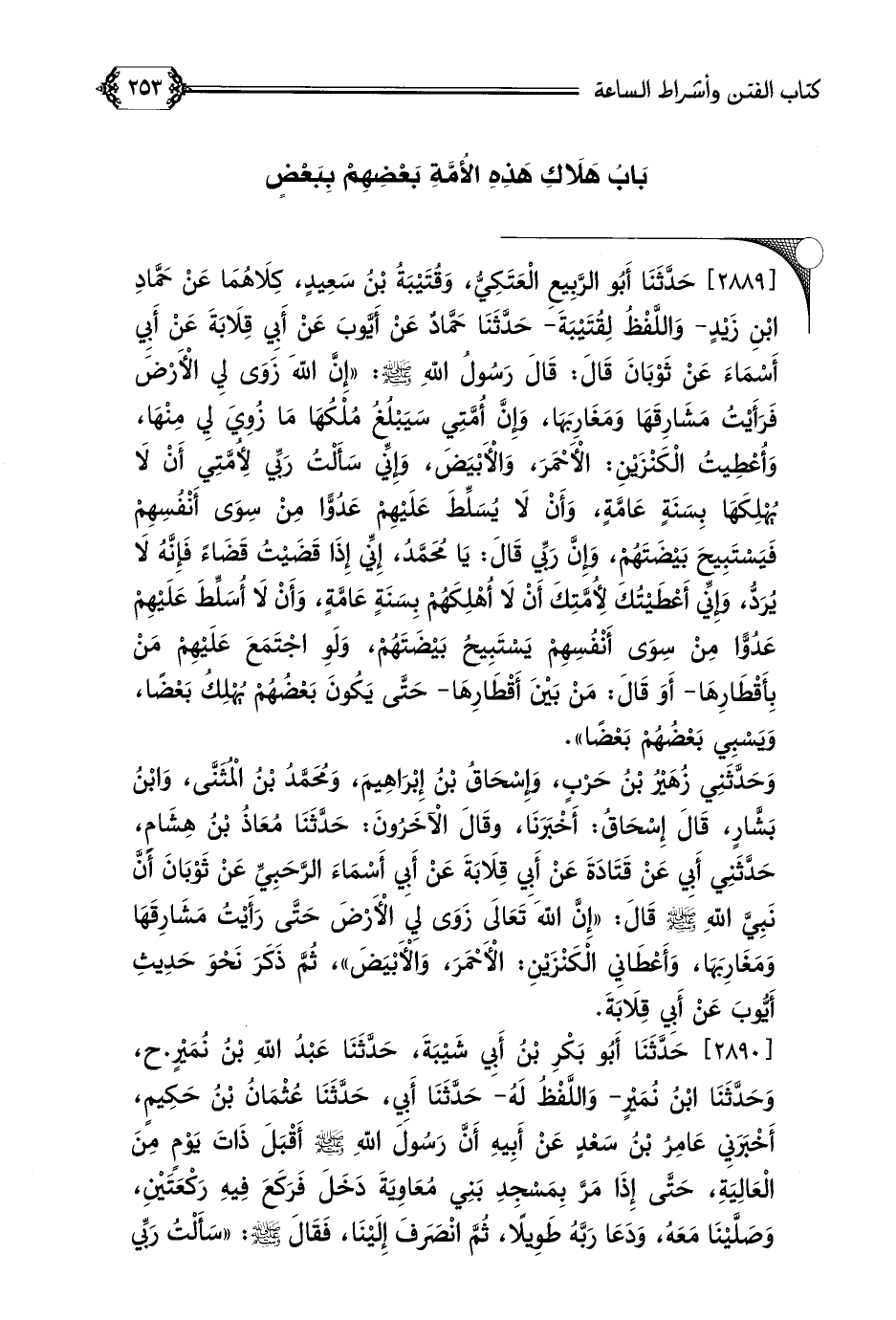 [٢٨٨٩] حَدَّثَنَا أَبُو الرَّبِيعِ الْعَتَكِيُّ، وَقُتَيْبَةُ بْنُ سَعِيدٍ، كِلَاهُمَا عَنْ حَمَّادِ بْنِ زَيْدٍ- وَاللَّفْظُ لِقُتَيْبَةَ- حَدَّثَنَا حَمَّادٌ عَنْ أَيَّوبَ عَنْ أَبِي قِلَابَةَ عَنْ أَبِي أَسْمَاءَ عَنْ ثَوْبَانَ قَالَ: قَالَ رَسُولُ اللَّهِ صلى الله عليه وسلم: ((إِنَّ اللَّهَ زَوَى لِي الْأَرْضَ فَرَأَيْتُ مَشَارِقَهَا وَمَغَارِبَهَا، وَإِنَّ أُمَّتِي سَيَبْلُغُ مُلْكُهَا مَا زُوِيَ لِي مِنْهَا، وَأُعْطِيتُ الْكَنْزَيْنِ: الْأَحْمَرَ، وَالْأَبْيَضَ، وَإِنِّي سَأَلْتُ رَبِّي لِأُمَّتِي أَنْ لَا يُهْلِكَهَا بِسَنَةٍ عَامَّةٍ، وَأَنْ لَا يُسَلِّطَ عَلَيْهِمْ عَدُوًّا مِنْ سِوَى أَنْفُسِهِمْ فَيَسْتَبِيحَ بَيْضَتَهُمْ، وَإِنَّ رَبِّي قَالَ يَا مُحَمَّدُ: إِنِّي إِذَا قَضَيْتُ قَضَاءً فَإِنَّهُ لَا يُرَدُّ، وَإِنِّي أَعْطَيْتُكَ لِأُمَّتِكَ أَنْ لَا أُهْلِكَهُمْ بِسَنَةٍ عَامَّةٍ، وَأَنْ لَا أُسَلِّطَ عَلَيْهِمْ عَدُوًّا مِنْ سِوَى أَنْفُسِهِمْ يَسْتَبِيحُ بَيْضَتَهُمْ، وَلَوِ اجْتَمَعَ عَلَيْهِمْ مَنْ بِأَقْطَارِهَا- أَوَ قَالَ: مَنْ بَيْنَ أَقْطَارِهَا- حَتَّى يَكُونَ بَعْضُهُمْ يُهْلِكُ بَعْضًا، وَيَسْبِي بَعْضُهُمْ بَعْضًا)).