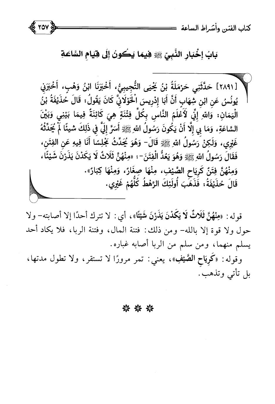 [٢٨٩١] حَدَّثَنِي حَرْمَلَةُ بْنُ يَحْيَى التُّجِيبِيُّ، أَخْبَرَنَا ابْنُ وَهْبٍ، أَخْبَرَنِي يُونُسُ عَنِ ابْنِ شِهَابٍ أَنَّ أَبَا إِدْرِيسَ الْخَوْلَانِيَّ كَانَ يَقُولُ: قَالَ حُذَيْفَةُ بْنُ الْيَمَانِ: وَاللَّهِ إِنِّي لَأَعْلَمُ النَّاسِ بِكُلِّ فِتْنَةٍ هِيَ كَائِنَةٌ فِيمَا بَيْنِي وَبَيْنَ السَّاعَةِ، وَمَا بِي إِلَّا أَنْ يَكُونَ رَسُولُ اللَّهِ صلى الله عليه وسلم أَسَرَّ إِلَيَّ فِي ذَلِكَ شيئًا لَمْ يُحَدِّثْهُ غَيْرِي، وَلَكِنْ رَسُولُ اللَّهِ صلى الله عليه وسلم قَالَ- وَهُوَ يُحَدِّثُ مَجْلِسًا أَنَا فِيهِ عَنِ الفِتَنِ، فَقَالَ رَسُولُ اللَّهِ صلى الله عليه وسلم وَهُوَ يَعُدُّ الْفِتَنَ-: ((مِنْهُنَّ ثَلَاثٌ لَا يَكَدْنَ يَذَرْنَ شَيْئًا، وَمِنْهُنَّ فِتَنٌ كَرِيَاحِ الصَّيْفِ، مِنْهَا صِغَارٌ، وَمِنْهَا كِبَارٌ)).