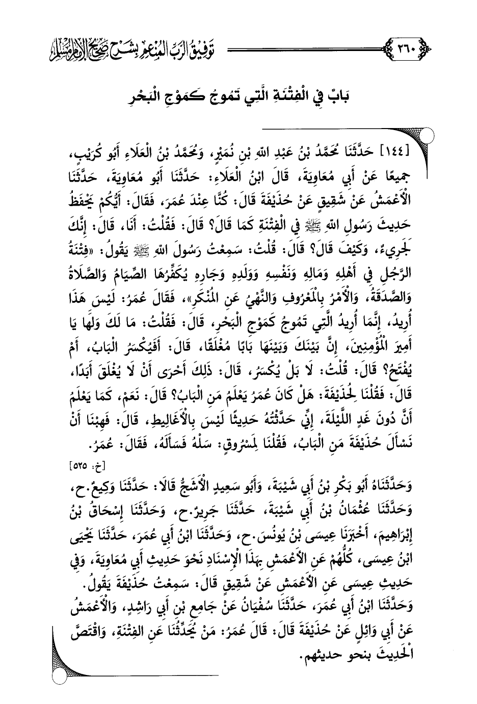 [١٤٤] حَدَّثَنَا مُحَمَّدُ بْنُ عَبْدِ اللَّهِ بْنِ نُمَيْرٍ، وَمُحَمَّدُ بْنُ الْعَلَاءِ أَبُو كُرَيْبٍ، جميعًا عَنْ أَبِي مُعَاوِيَةَ، قَالَ ابْنُ الْعَلَاءِ: حَدَّثَنَا أَبُو مُعَاوِيَةَ، حَدَّثَنَا الْأَعْمَشُ عَنْ شَقِيقٍ عَنْ حُذَيْفَةَ قَالَ: كُنَّا عِنْدَ عُمَرَ، فَقَالَ: أَيُّكُمْ يَحْفَظُ حَدِيثَ رَسُولِ اللَّهِ صلى الله عليه وسلم فِي الْفِتْنَةِ كَمَا قَالَ؟ قَالَ: فَقُلْتُ: أَنَا، قَالَ: إِنَّكَ لَجَرِيءٌ، وَكَيْفَ قَالَ؟ قَالَ: قُلْتُ: سَمِعْتُ رَسُولَ اللَّهِ صلى الله عليه وسلم يَقُولُ: ((فِتْنَةُ الرَّجُلِ فِي أَهْلِهِ وَمَالِهِ وَنَفْسِهِ وَوَلَدِهِ وَجَارِهِ يُكَفِّرُهَا الصِّيَامُ وَالصَّلَاةُ وَالصَّدَقَةُ، وَالْأَمْرُ بِالْمَعْرُوفِ وَالنَّهْيُ عَنِ المُنْكَرِ))، فَقَالَ عُمَرُ: لَيْسَ هَذَا أُرِيدُ، إِنَّمَا أُرِيدُ الَّتِي تَمُوجُ كَمَوْجِ الْبَحْرِ، قَالَ: فَقُلْتُ: مَا لَكَ وَلَهَا يَا أَمِيرَ الْمُؤْمِنِينَ، إِنَّ بَيْنَكَ وَبَيْنَهَا بَابًا مُغْلَقًا، قَالَ: أَفَيُكْسَرُ الْبَابُ، أَمْ يُفْتَحُ؟ قَالَ: قُلْتُ: لَا بَلْ يُكْسَرُ، قَالَ: ذَلِكَ أَحْرَى أَنْ لَا يُغْلَقَ أَبَدًا، قَالَ: فَقُلْنَا لِحُذَيْفَةَ: هَلْ كَانَ عُمَرُ يَعْلَمُ مَنِ الْبَابُ؟ قَالَ: نَعَمْ، كَمَا يَعْلَمُ أَنَّ دُونَ غَدٍ اللَّيْلَةَ، إِنِّي حَدَّثْتُهُ حَدِيثًا لَيْسَ بِالْأَغَالِيطِ، قَالَ: فَهِبْنَا أَنْ نَسْأَلَ حُذَيْفَةَ مَنِ الْبَابُ، فَقُلْنَا لِمَسْرُوقٍ: سَلْهُ فَسَأَلَهُ، فَقَالَ: عُمَرُ.