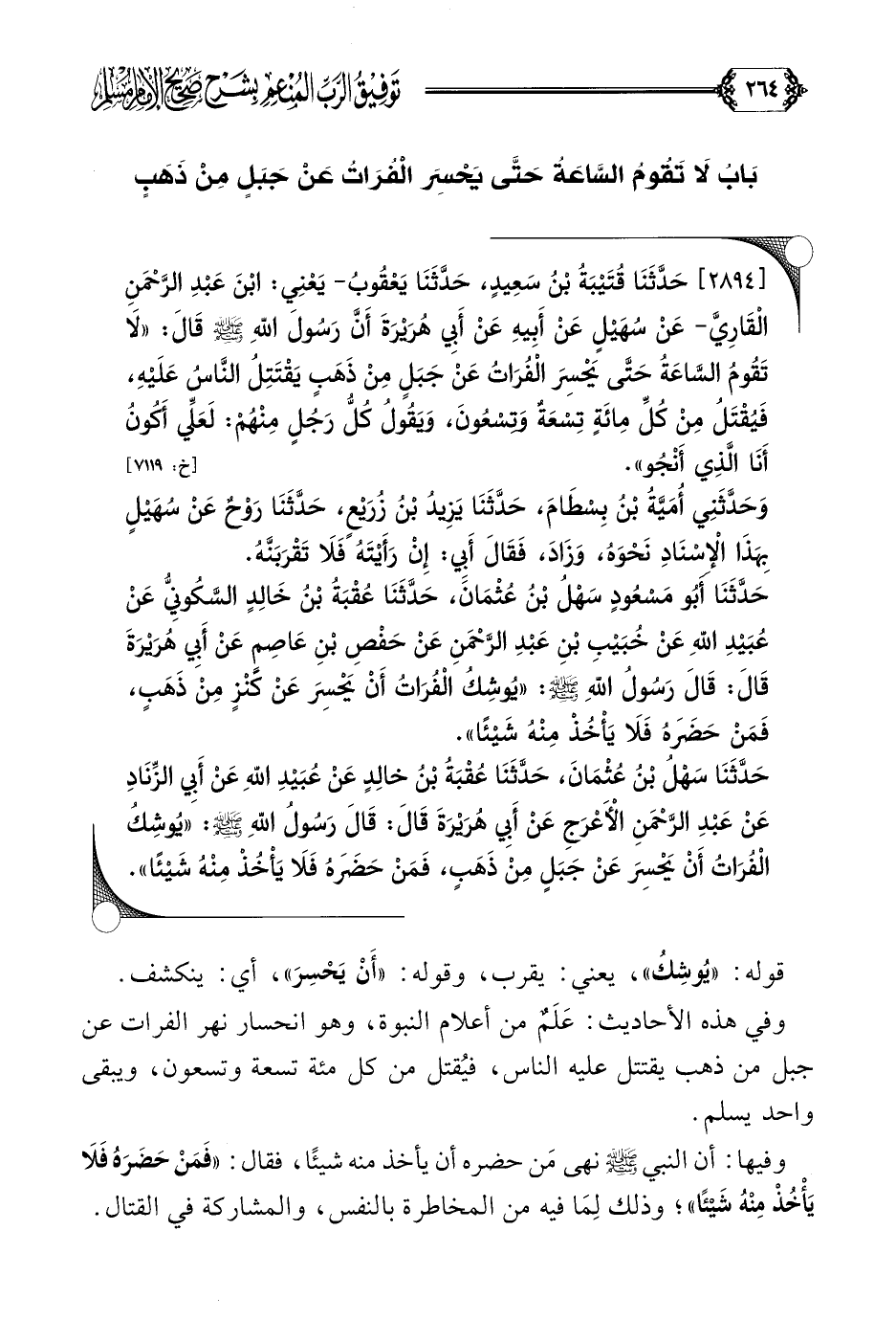 [٢٨٩٤] حَدَّثَنَا قُتَيْبَةُ بْنُ سَعِيدٍ، حَدَّثَنَا يَعْقُوبُ- يَعْنِي: ابْنَ عَبْدِ الرَّحْمَنِ الْقَارِيَّ- عَنْ سُهَيْلٍ عَنْ أَبِيهِ عَنْ أَبِي هُرَيْرَةَ أَنَّ رَسُولَ اللَّهِ صلى الله عليه وسلم قَالَ: ((لَا تَقُومُ السَّاعَةُ حَتَّى يَحْسِرَ الْفُرَاتُ عَنْ جَبَلٍ مِنْ ذَهَبٍ يَقْتَتِلُ النَّاسُ عَلَيْهِ، فَيُقْتَلُ مِنْ كُلِّ مِائَةٍ تِسْعَةٌ وَتِسْعُونَ، وَيَقُولُ كُلُّ رَجُلٍ مِنْهُمْ: لَعَلِّي أَكُونُ أَنَا الَّذِي أَنْجُو)).