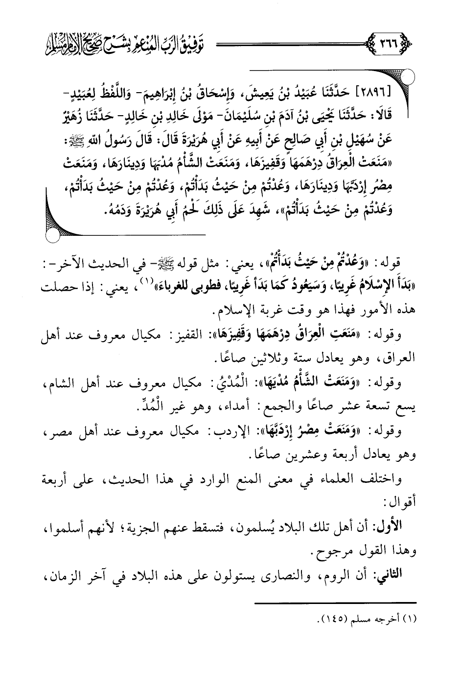[٢٨٩٦] حَدَّثَنَا عُبَيْدُ بْنُ يَعِيشَ، وَإِسْحَاقُ بْنُ إِبْرَاهِيمَ- وَاللَّفْظُ لِعُبَيْدٍ- قَالَا: حَدَّثَنَا يَحْيَى بْنُ آدَمَ بْنِ سُلَيْمَانَ- مَوْلَى خَالِدِ بْنِ خَالِدٍ- حَدَّثَنَا زُهَيْرٌ عَنْ سُهَيْلِ بْنِ أَبِي صَالِحٍ عَنْ أَبِيهِ عَنْ أَبِي هُرَيْرَةَ قَالَ: قَالَ رَسُولُ اللَّهِ صلى الله عليه وسلم: ((مَنَعَتْ الْعِرَاقُ دِرْهَمَهَا وَقَفِيزَهَا، وَمَنَعَتْ الشَّأْمُ مُدْيَهَا وَدِينَارَهَا، وَمَنَعَتْ مِصْرُ إِرْدَبَّهَا وَدِينَارَهَا، وَعُدْتُمْ مِنْ حَيْثُ بَدَأْتُمْ، وَعُدْتُمْ مِنْ حَيْثُ بَدَأْتُمْ، وَعُدْتُمْ مِنْ حَيْثُ بَدَأْتُمْ))، شَهِدَ عَلَى ذَلِكَ لَحْمُ أَبِي هُرَيْرَةَ وَدَمُهُ.