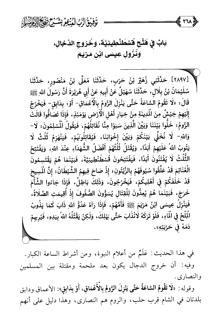 [٢٨٩٧] حَدَّثَنِي زُهَيْرُ بْنُ حَرْبٍ، حَدَّثَنَا مُعَلَّى بْنُ مَنْصُورٍ، حَدَّثَنَا سُلَيْمَانُ بْنُ بِلَالٍ، حَدَّثَنَا سُهَيْلٌ عَنْ أَبِيهِ عَنْ أَبِي هُرَيْرَةَ أَنَّ رَسُولَ اللَّهِ صلى الله عليه وسلم قَالَ: ((لَا تَقُومُ السَّاعَةُ حَتَّى يَنْزِلَ الرُّومُ بِالْأَعْمَاقِ- أَوْ: بِدَابِقٍ- فَيَخْرُجُ إِلَيْهِمْ جَيْشٌ مِنْ الْمَدِينَةِ مِنْ خِيَارِ أَهْلِ الْأَرْضِ يَوْمَئِذٍ، فَإِذَا تَصَافُّوا قَالَتْ الرُّومُ: خَلُّوا بَيْنَنَا وَبَيْنَ الَّذِينَ سَبَوْا مِنَّا نُقَاتِلْهُمْ، فَيَقُولُ الْمُسْلِمُونَ: لَا- وَاللَّهِ- لَا نُخَلِّي بَيْنَكُمْ وَبَيْنَ إِخْوَانِنَا، فَيُقَاتِلُونَهُمْ، فَيَنْهَزِمُ ثُلُثٌ لَا يَتُوبُ اللَّهُ عَلَيْهِمْ أَبَدًا، وَيُقْتَلُ ثُلُثُهُمْ أَفْضَلُ الشُّهَدَاءِ عِنْدَ اللَّهِ، وَيَفْتَتِحُ الثُّلُثُ لَا يُفْتَنُونَ أَبَدًا، فَيَفْتَتِحُونَ قُسْطَنْطِينِيَّةَ، فَبَيْنَمَا هُمْ يَقْتَسِمُونَ الْغَنَائِمَ قَدْ عَلَّقُوا سُيُوفَهُمْ بِالزَّيْتُونِ؛ إِذْ صَاحَ فِيهِمُ الشَّيْطَانُ: إِنَّ الْمَسِيحَ قَدْ خَلَفَكُمْ فِي أَهْلِيكُمْ، فَيَخْرُجُونَ، وَذَلِكَ بَاطِلٌ، فَإِذَا جَاءُوا الشَّأْمَ خَرَجَ، فَبَيْنَمَا هُمْ يُعِدُّونَ لِلْقِتَالِ يُسَوُّونَ الصُّفُوفَ إِذْ أُقِيمَتِ الصَّلَاةُ، فَيَنْزِلُ عِيسَى ابْنُ مَرْيَمَ صلى الله عليه وسلم فَأَمَّهُمْ، فَإِذَا رَآهُ عَدُوُّ اللَّهِ ذَابَ كَمَا يَذُوبُ الْمِلْحُ فِي الْمَاءِ، فَلَوْ تَرَكَهُ لَانْذَابَ حَتَّى يَهْلِكَ، وَلَكِنْ يَقْتُلُهُ اللَّهُ بِيَدِهِ، فَيُرِيهِمْ دَمَهُ فِي حَرْبَتِهِ)).
