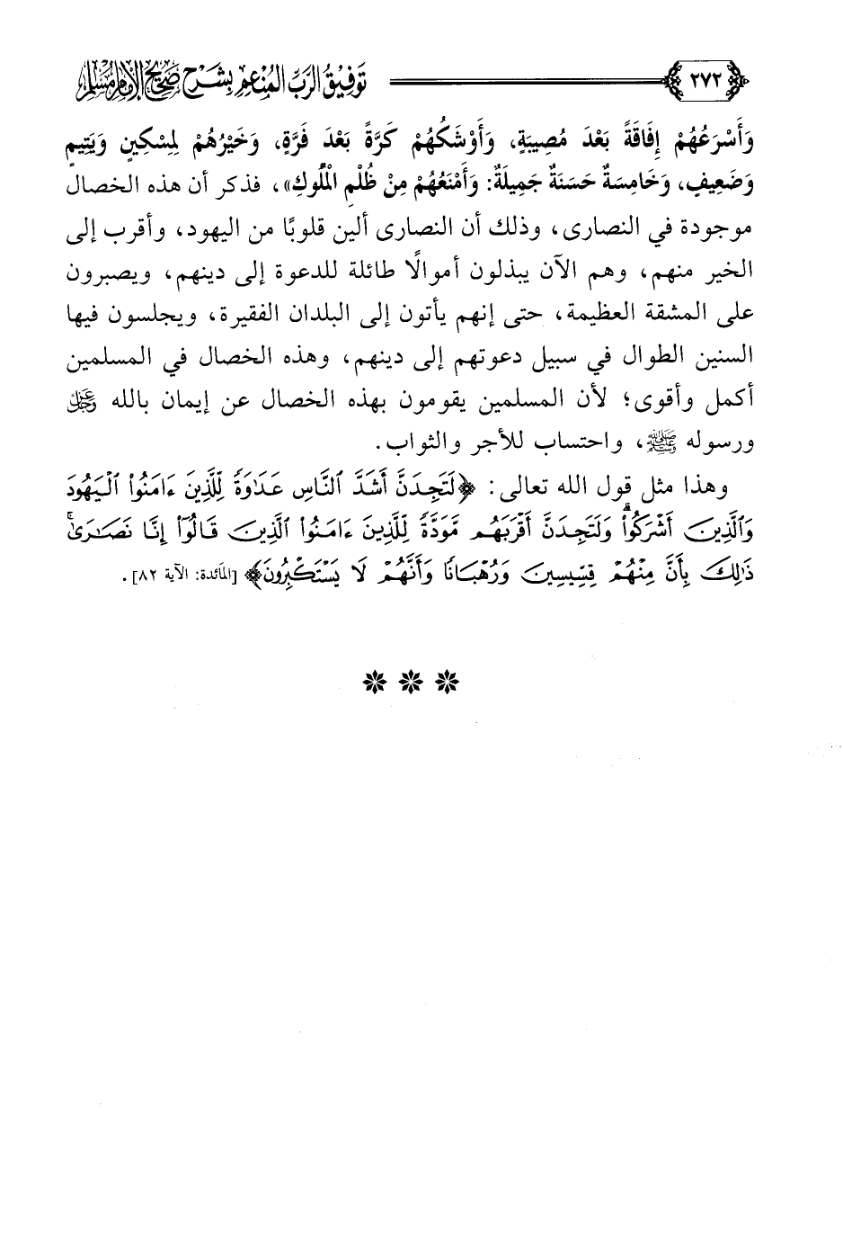 وَأَسْرَعُهُمْ إِفَاقَةً بَعْدَ مُصِيبَةٍ، وَأَوْشَكُهُمْ كَرَّةً بَعْدَ فَرَّةٍ، وَخَيْرُهُمْ لِمِسْكِينٍ وَيَتِيمٍ وَضَعِيفٍ، وَخَامِسَةٌ حَسَنَةٌ جَمِيلَةٌ: وَأَمْنَعُهُمْ مِنْ ظُلْمِ الْمُلُوكِ))، فذكر أن هذه الخصال موجودة في النصارى، وذلك أن النصارى ألين قلوبًا من اليهود، وأقرب إلى الخير منهم، وهم الآن يبذلون أموالًا طائلة للدعوة إلى دينهم، ويصبرون على المشقة العظيمة، حتى إنهم يأتون إلى البلدان الفقيرة، ويجلسون فيها السنين الطوال في سبيل دعوتهم إلى دينهم، وهذه الخصال في المسلمين أكمل وأقوى؛ لأن المسلمين يقومون بهذه الخصال عن إيمان بالله عز وجل ورسوله صلى الله عليه وسلم، واحتساب للأجر والثواب.
