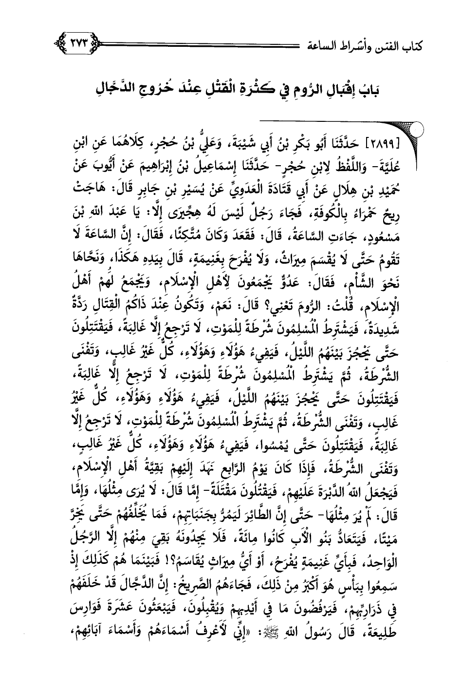 [٢٨٩٩] حَدَّثَنَا أَبُو بَكْرِ بْنُ أَبِي شَيْبَةَ، وَعَلِيُّ بْنُ حُجْرٍ، كِلَاهُمَا عَنِ ابْنِ عُلَيَّةَ- وَاللَّفْظُ لِابْنِ حُجْرٍ- حَدَّثَنَا إِسْمَاعِيلُ بْنُ إِبْرَاهِيمَ عَنْ أَيُّوبَ عَنْ حُمَيْدِ بْنِ هِلَالٍ عَنْ أَبِي قَتَادَةَ الْعَدَوِيِّ عَنْ يُسَيْرِ بْنِ جَابِرٍ قَالَ: هَاجَتْ رِيحٌ حَمْرَاءُ بِالْكُوفَةِ، فَجَاءَ رَجُلٌ لَيْسَ لَهُ هِجِّيرَى إِلَّا: يَا عَبْدَ اللَّهِ بْنَ مَسْعُودٍ، جَاءَتِ السَّاعَةُ، قَالَ: فَقَعَدَ وَكَانَ مُتَّكِئًا، فَقَالَ: إِنَّ السَّاعَةَ لَا تَقُومُ حَتَّى لَا يُقْسَمَ مِيرَاثٌ، وَلَا يُفْرَحَ بِغَنِيمَةٍ، قَالَ بِيَدِهِ هَكَذَا، وَنَحَّاهَا نَحْوَ الشَّأْمِ، فَقَالَ: عَدُوٌّ يَجْمَعُونَ لِأَهْلِ الْإِسْلَامِ، وَيَجْمَعُ لَهُمْ أَهْلُ الْإِسْلَامِ، قُلْتُ: الرُّومَ تَعْنِي؟ قَالَ: نَعَمْ، وَتَكُونُ عِنْدَ ذَاكُمُ الْقِتَالِ رَدَّةٌ شَدِيدَةٌ، فَيَشْتَرِطُ الْمُسْلِمُونَ شُرْطَةً لِلْمَوْتِ، لَا تَرْجِعُ إِلَّا غَالِبَةً، فَيَقْتَتِلُونَ حَتَّى يَحْجُزَ بَيْنَهُمُ اللَّيْلُ، فَيَفِيءُ هَؤُلَاءِ وَهَؤُلَاءِ، كُلٌّ غَيْرُ غَالِبٍ، وَتَفْنَى الشُّرْطَةُ، ثُمَّ يَشْتَرِطُ الْمُسْلِمُونَ شُرْطَةً لِلْمَوْتِ، لَا تَرْجِعُ إِلَّا غَالِبَةً، فَيَقْتَتِلُونَ حَتَّى يَحْجُزَ بَيْنَهُمُ اللَّيْلُ، فَيَفِيءُ هَؤُلَاءِ وَهَؤُلَاءِ، كُلٌّ غَيْرُ غَالِبٍ، وَتَفْنَى الشُّرْطَةُ، ثُمَّ يَشْتَرِطُ الْمُسْلِمُونَ شُرْطَةً لِلْمَوْتِ، لَا تَرْجِعُ إِلَّا غَالِبَةً، فَيَقْتَتِلُونَ حَتَّى يُمْسُوا، فَيَفِيءُ هَؤُلَاءِ وَهَؤُلَاءِ، كُلٌّ غَيْرُ غَالِبٍ، وَتَفْنَى الشُّرْطَةُ، فَإِذَا كَانَ يَوْمُ الرَّابِعِ نَهَدَ إِلَيْهِمْ بَقِيَّةُ أَهْلِ الْإِسْلَامِ، فَيَجْعَلُ اللَّهُ الدَّبْرَةَ عَلَيْهِمْ، فَيَقْتُلُونَ مَقْتَلَةً- إِمَّا قَالَ: لَا يُرَى