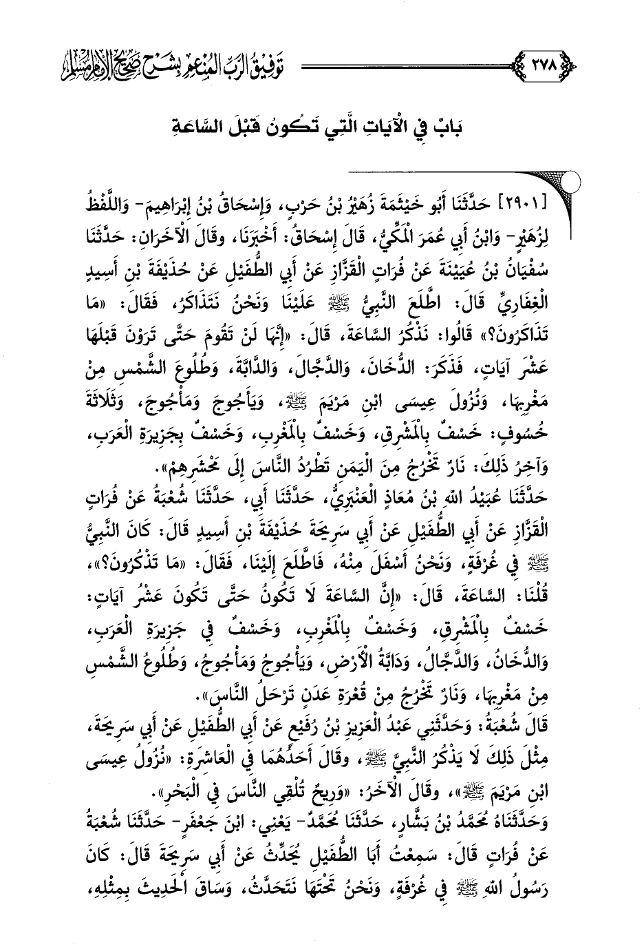 [٢٩٠١] حَدَّثَنَا أَبُو خَيْثَمَةَ زُهَيْرُ بْنُ حَرْبٍ، وَإِسْحَاقُ بْنُ إِبْرَاهِيمَ- وَاللَّفْظُ لِزُهَيْرٍ- وَابْنُ أَبِي عُمَرَ الْمَكِّيُّ، قَالَ إِسْحَاقُ: أَخْبَرَنَا، وقَالَ الْآخَرَانِ: حَدَّثَنَا سُفْيَانُ بْنُ عُيَيْنَةَ عَنْ فُرَاتٍ الْقَزَّازِ عَنْ أَبِي الطُّفَيْلِ عَنْ حُذَيْفَةَ بْنِ أَسِيدٍ الْغِفَارِيِّ قَالَ: اطَّلَعَ النَّبِيُّ صلى الله عليه وسلم عَلَيْنَا وَنَحْنُ نَتَذَاكَرُ، فَقَالَ: ((مَا تَذَاكَرُونَ؟ )) قَالُوا: نَذْكُرُ السَّاعَةَ، قَالَ: ((إِنَّهَا لَنْ تَقُومَ حَتَّى تَرَوْنَ قَبْلَهَا عَشْرَ آيَاتٍ، فَذَكَرَ: الدُّخَانَ، وَالدَّجَّالَ، وَالدَّابَّةَ، وَطُلُوعَ الشَّمْسِ مِنْ مَغْرِبِهَا، وَنُزُولَ عِيسَى ابْنِ مَرْيَمَ صلى الله عليه وسلم، وَيَأَجُوجَ وَمَأْجُوجَ، وَثَلَاثَةَ خُسُوفٍ: خَسْفٌ بِالْمَشْرِقِ، وَخَسْفٌ بِالْمَغْرِبِ، وَخَسْفٌ بِجَزِيرَةِ الْعَرَبِ، وَآخِرُ ذَلِكَ: نَارٌ تَخْرُجُ مِنْ الْيَمَنِ تَطْرُدُ النَّاسَ إِلَى مَحْشَرِهِمْ)).