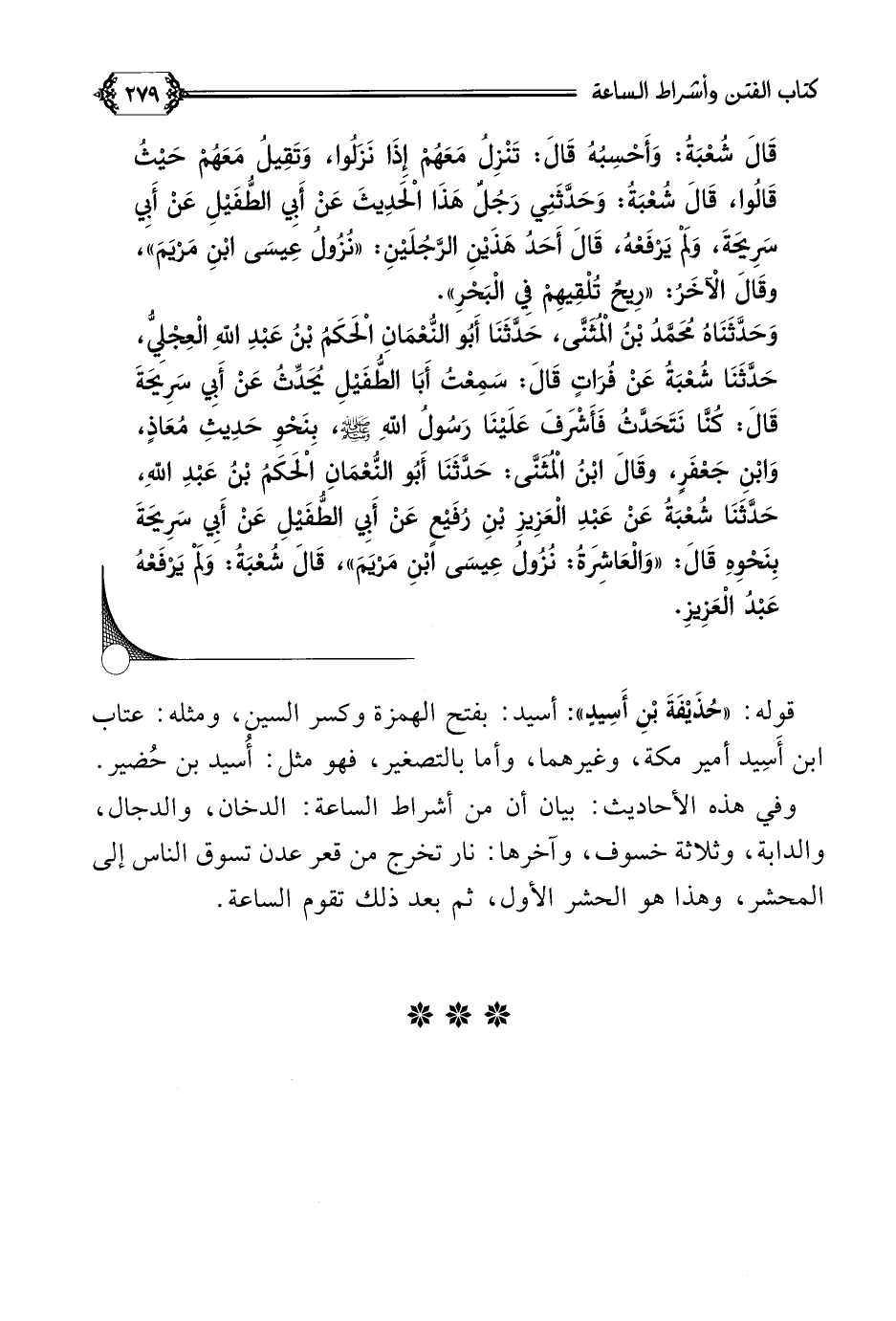 وَحَدَّثَنَاهُ مُحَمَّدُ بْنُ الْمُثَنَّى، حَدَّثَنَا أَبُو النُّعْمَانِ الْحَكَمُ بْنُ عَبْدِ اللَّهِ الْعِجْلِيُّ، حَدَّثَنَا شُعْبَةُ عَنْ فُرَاتٍ قَالَ: سَمِعْتُ أَبَا الطُّفَيْلِ يُحَدِّثُ عَنْ أَبِي سَرِيحَةَ قَالَ: كُنَّا نَتَحَدَّثُ فَأَشْرَفَ عَلَيْنَا رَسُولُ اللَّهِ صلى الله عليه وسلم، بِنَحْوِ حَدِيثِ مُعَاذٍ، وَابْنِ جَعْفَرٍ، وقَالَ ابْنُ الْمُثَنَّى: حَدَّثَنَا أَبُو النُّعْمَانِ الْحَكَمُ بْنُ عَبْدِ اللَّهِ، حَدَّثَنَا شُعْبَةُ عَنْ عَبْدِ الْعَزِيزِ بْنِ رُفَيْعٍ عَنْ أَبِي الطُّفَيْلِ عَنْ أَبِي سَرِيحَةَ بِنَحْوِهِ قَالَ: ((وَالْعَاشِرَةُ: نُزُولُ عِيسَى ابْنِ مَرْيَمَ))، قَالَ شُعْبَةُ: وَلَمْ يَرْفَعْهُ عَبْدُ الْعَزِيزِ.