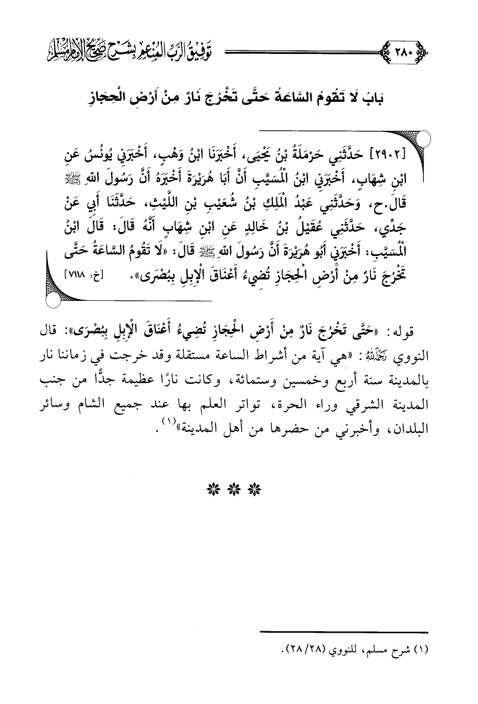 قوله: ((حَتَّى تَخْرُجَ نَارٌ مِنْ أَرْضِ الْحِجَازِ تُضِيءُ أَعْنَاقَ الْإِبِلِ بِبُصْرَى)): قال النووي رحمه الله: ((هي آية من أشراط الساعة مستقلة وقد خرجت في زماننا نار بالمدينة سنة أربع وخمسين وستمائة وكانت نارًا عظيمة جدًّا من جنب المدينة الشرقي وراء الحرة، تواتر العلم بها عند جميع الشام وسائر البلدان، وأخبرني من حضرها من أهل المدينة)) (¬١).