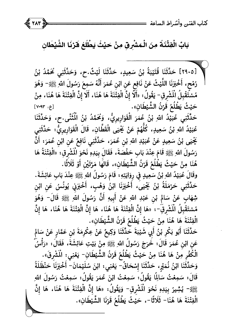 حَدَّثَنِي عُبَيْدُ اللَّهِ بْنُ عُمَرَ الْقَوَارِيرِيُّ، وَمُحَمَّدُ بْنُ الْمُثَنَّى. ح، وَحَدَّثَنَا عُبَيْدُ اللَّهِ بْنُ سَعِيدٍ، كُلُّهُمْ عَنْ يَحْيَى الْقَطَّانِ، قَالَ الْقَوَارِيرِيُّ: حَدَّثَنِي يَحْيَى بْنُ سَعِيدٍ عَنْ عُبَيْدِ اللَّهِ بْنِ عُمَرَ، حَدَّثَنِي نَافِعٌ عَنِ ابْنِ عُمَرَ: أَنَّ رَسُولَ اللَّهِ صلى الله عليه وسلم قَامَ عِنْدَ بَابِ حَفْصَةَ، فَقَالَ بِيَدِهِ نَحْوَ الْمَشْرِقِ: ((الْفِتْنَةُ هَا هُنَا مِنْ حَيْثُ يَطْلُعُ قَرْنُ الشَّيْطَانِ))، قَالَهَا مَرَّتَيْنِ أَوْ ثَلَاثًا.