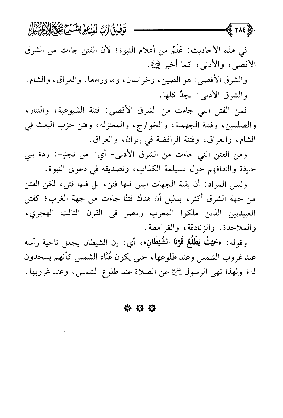وليس المراد: أن بقية الجهات ليس فيها فتن، بل فيها فتن، لكن الفتن من جهة الشرق أكثر، بدليل أن هناك فتنًا جاءت من جهة الغرب؛ كفتن العبيديين الذين ملكوا المغرب ومصر في القرن الثالث الهجري، والملاحدة، والزنادقة، والقرامطة.