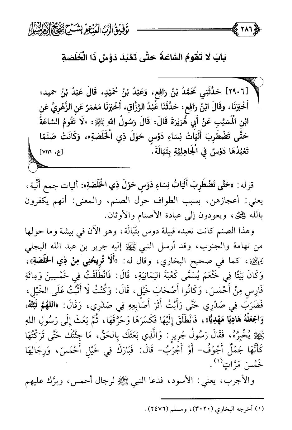 [٢٩٠٦] حَدَّثَنِي مُحَمَّدُ بْنُ رَافِعٍ، وَعَبْدُ بْنُ حُمَيْدٍ، قَالَ عَبْدُ بْنُ حميد: أَخْبَرَنَا، وقَالَ ابْنُ رَافِعٍ: حَدَّثَنَا عَبْدُ الرَّزَّاقِ، أَخْبَرَنَا مَعْمَرٌ عَنِ الزُّهْرِيِّ عَنِ ابْنِ الْمُسَيَّبِ عَنْ أَبِي هُرَيْرَةَ قَالَ: قَالَ رَسُولُ اللَّهِ صلى الله عليه وسلم: ((لَا تَقُومُ السَّاعَةُ حَتَّى تَضْطَرِبَ أَلَيَاتُ نِسَاءِ دَوْسٍ حَوْلَ ذِي الْخَلَصَةِ))، وَكَانَتْ صَنَمًا تَعْبُدُهَا دَوْسٌ فِي الْجَاهِلِيَّةِ بِتَبَالَةَ.
