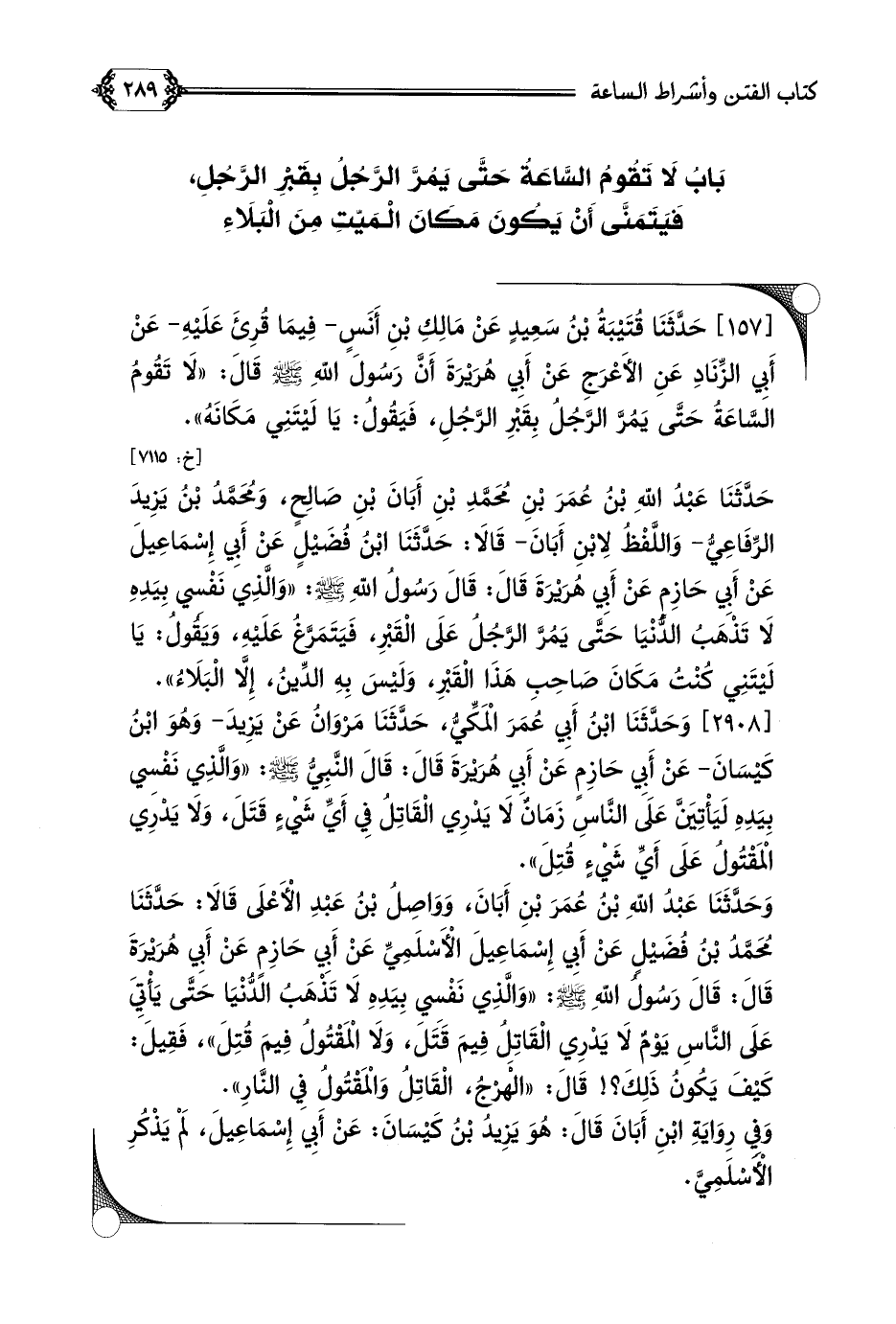 [١٥٧] حَدَّثَنَا قُتَيْبَةُ بْنُ سَعِيدٍ عَنْ مَالِكِ بْنِ أَنَسٍ- فِيمَا قُرِئَ عَلَيْهِ- عَنْ أَبِي الزِّنَادِ عَنِ الأَعْرَجِ عَنْ أَبِي هُرَيْرَةَ أَنَّ رَسُولَ اللَّهِ صلى الله عليه وسلم قَالَ: ((لَا تَقُومُ السَّاعَةُ حَتَّى يَمُرَّ الرَّجُلُ بِقَبْرِ الرَّجُلِ، فَيَقُولُ: يَا لَيْتَنِي مَكَانَهُ)).