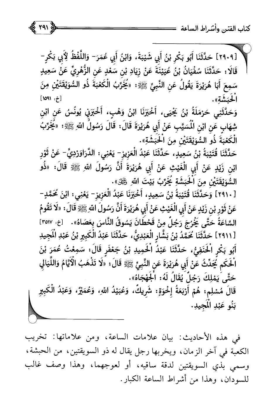 في هذه الأحاديث: بيان علامات الساعة، ومن علاماتها: تخريب الكعبة في آخر الزمان، ويخربها رجل يقال له ذو السويقتين، من الحبشة، وسمي بذي السويقتين لدقة ساقيه، أو لعوجهما، وهذا وصف غالب للسودان، وهذا من أشراط الساعة الكبار.