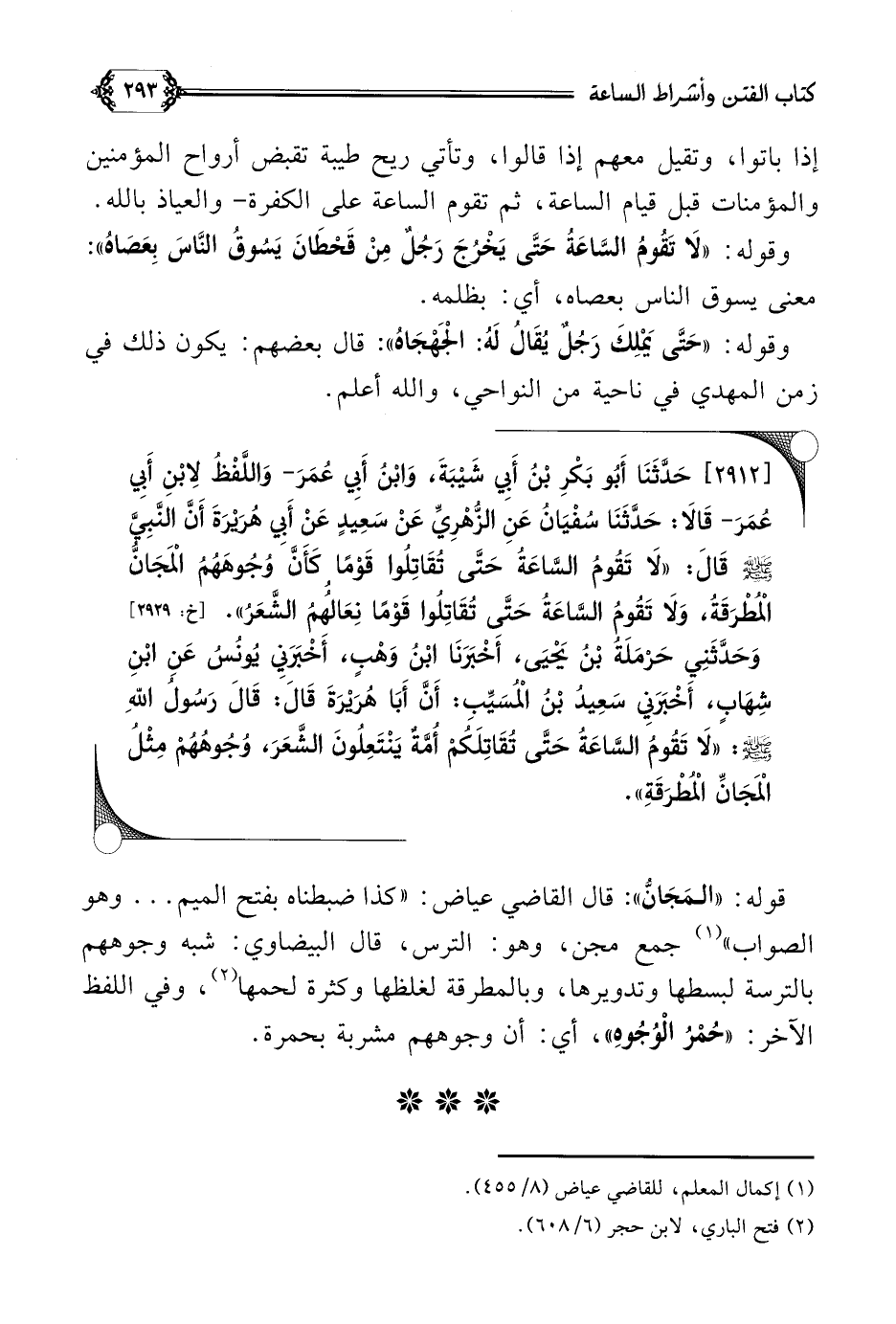 [٢٩١٢] حَدَّثَنَا أَبُو بَكْرِ بْنُ أَبِي شَيْبَةَ، وَابْنُ أَبِي عُمَرَ- وَاللَّفْظُ لِابْنِ أَبِي عُمَرَ- قَالَا: حَدَّثَنَا سُفْيَانُ عَنِ الزُّهْرِيِّ عَنْ سَعِيدٍ عَنْ أَبِي هُرَيْرَةَ أَنَّ النَّبِيَّ صلى الله عليه وسلم قَالَ: ((لَا تَقُومُ السَّاعَةُ حَتَّى تُقَاتِلُوا قَوْمًا كَأَنَّ وُجُوهَهُمُ الْمَجَانُّ الْمُطْرَقَةُ، وَلَا تَقُومُ السَّاعَةُ حَتَّى تُقَاتِلُوا قَوْمًا نِعَالُهُمُ الشَّعَرُ)).