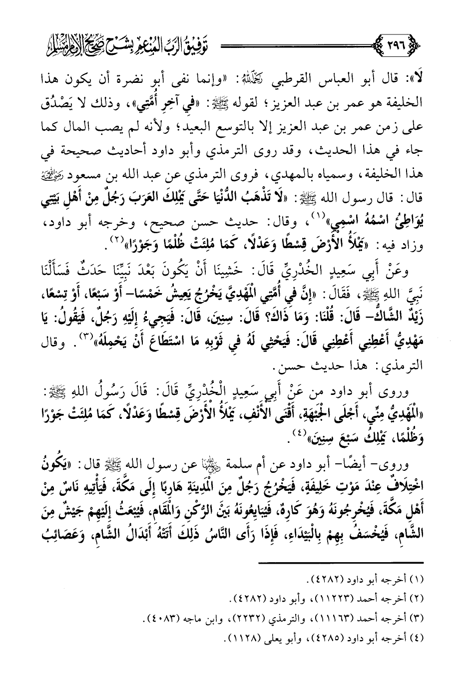 لَا)): قال أبو العباس القرطبي رحمه الله: ((وإنما نفى أبو نضرة أن يكون هذا الخليفة هو عمر بن عبد العزيز؛ لقوله صلى الله عليه وسلم: ((فِي آخِرِ أُمَّتِي))، وذلك لا يَصْدُق على زمن عمر بن عبد العزيز إلا بالتوسع البعيد؛ ولأنه لم يصب المال كما جاء في هذا الحديث، وقد روى الترمذي وأبو داود أحاديث صحيحة في هذا الخليفة، وسمياه بالمهدي، فروى الترمذي عن عبد الله بن مسعود رضي الله عنه قال: قال رسول الله صلى الله عليه وسلم: ((لا تَذْهَبُ الدُّنْيَا حَتَّى يَمْلِكَ العَرَبَ رَجُلٌ مِنْ أَهْلِ بَيْتِي يُوَاطِئُ اسْمُهُ اسْمِي)) (¬١)، وقال: حديث حسن صحيح، وخرجه أبو داود، وزاد فيه: ((يَمْلَأُ الْأَرْضَ قِسْطًا وَعَدْلًا، كَمَا مُلِئَتْ ظُلْمًا وَجَوْرًا)) (¬٢). وعَنْ أَبِي سَعِيدٍ الخُدْرِيِّ قَالَ: خَشِينَا أَنْ يَكُونَ بَعْدَ نَبِيِّنَا حَدَثٌ فَسَأَلْنَا نَبِيَّ اللهِ صَلَّى اللَّهُ عَلَيْهِ وَسَلَّمَ، فَقَالَ: ((إِنَّ فِي أُمَّتِي الْمَهْدِيَّ يَخْرُجُ يَعِيشُ خَمْسًا- أَوْ سَبْعًا، أَوْ تِسْعًا، زَيْدٌ الشَّاكُّ- قَالَ: قُلْنَا: وَمَا ذَاكَ؟ قَالَ: سِنِينَ، قَالَ: فَيَجِيءُ إِلَيْهِ رَجُلٌ، فَيَقُولُ: يَا مَهْدِيُّ أَعْطِنِي أَعْطِنِي قَالَ: فَيَحْثِي لَهُ فِي ثَوْبِهِ مَا اسْتَطَاعَ أَنْ يَحْمِلَهُ)) (¬٣). وقال الترمذي: هذا حديث حسن.
