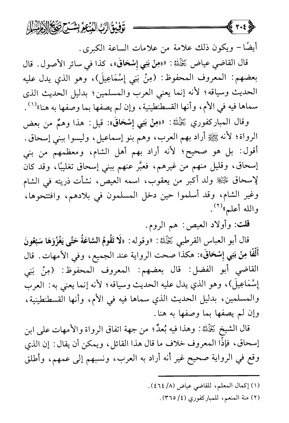 وقال المباركفوري رحمه الله: ((((مِنْ بَنِي إِسْحَاقَ)): قيل: هذا وهمٌ من بعض الرواة؛ لأنه صلى الله عليه وسلم أراد بهم العرب، وهم بنو إسماعيل، وليسوا ببني إسحاق. أقول: بل هو صحيح؛ لأنه أراد بهم أهل الشام، ومعظمهم من بني إسحاق، وقليل منهم من غيرهم، فعبَّر عنهم ببني إسحاق تغليبًا، وقد كان لإسحاق عليه السلام ولد أكبر من يعقوب، اسمه العيص، نشأت ذريته في الشام وغير الشام، وقد أسلموا حين دخل المسلمون في بلادهم، وافتتحوها، والله أعلم)) (¬٢).
