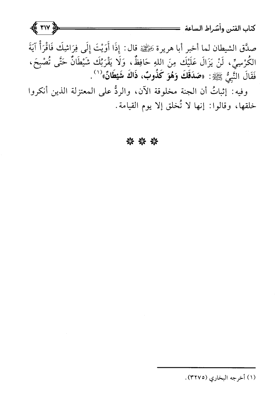 صدَّق الشيطان لما أخبر أبا هريرة رضي الله عنه قال: ((إِذَا أَوَيْتَ إِلَى فِرَاشِكَ فَاقْرَأْ آيَةَ الكُرْسِيِّ، لَنْ يَزَالَ عَلَيْكَ مِنَ اللَّهِ حَافِظٌ، وَلا يَقْرَبُكَ شَيْطَانٌ حَتَّى تُصْبِحَ، فَقَالَ النَّبِيُّ صَلَّى اللهُ عَلَيْهِ وَسَلَّمَ: صَدَقَكَ وَهُوَ كَذُوبٌ ذَاكَ شَيْطَانٌ)) (¬١).