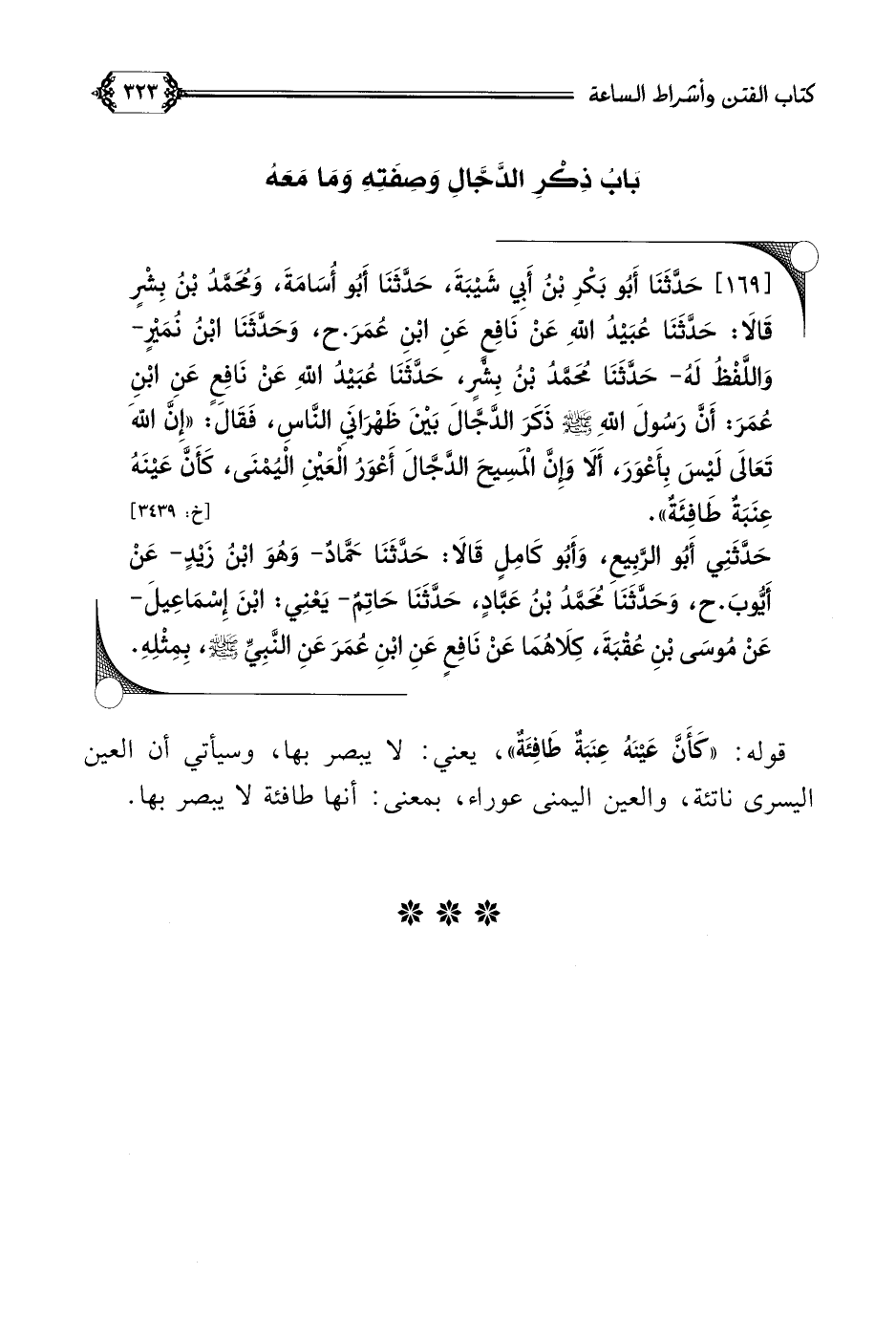 [١٦٩] حَدَّثَنَا أَبُو بَكْرِ بْنُ أَبِي شَيْبَةَ، حَدَّثَنَا أَبُو أُسَامَةَ، وَمُحَمَّدُ بْنُ بِشْرٍ قَالَا: حَدَّثَنَا عُبَيْدُ اللَّهِ عَنْ نَافِعٍ عَنِ ابْنِ عُمَرَ. ح، وَحَدَّثَنَا ابْنُ نُمَيْرٍ- وَاللَّفْظُ لَهُ- حَدَّثَنَا مُحَمَّدُ بْنُ بِشْرٍ، حَدَّثَنَا عُبَيْدُ اللَّهِ عَنْ نَافِعٍ عَنِ ابْنِ عُمَرَ: أَنَّ رَسُولَ اللَّهِ صلى الله عليه وسلم ذَكَرَ الدَّجَّالَ بَيْنَ ظَهْرَانَيِ النَّاسِ، فَقَالَ: ((إِنَّ اللَّهَ تَعَالَى لَيْسَ بِأَعْوَرَ، أَلَا وَإِنَّ الْمَسِيحَ الدَّجَّالَ أَعْوَرُ الْعَيْنِ الْيُمْنَى، كَأَنَّ عَيْنَهُ عِنَبَةٌ طَافِئَةٌ)).