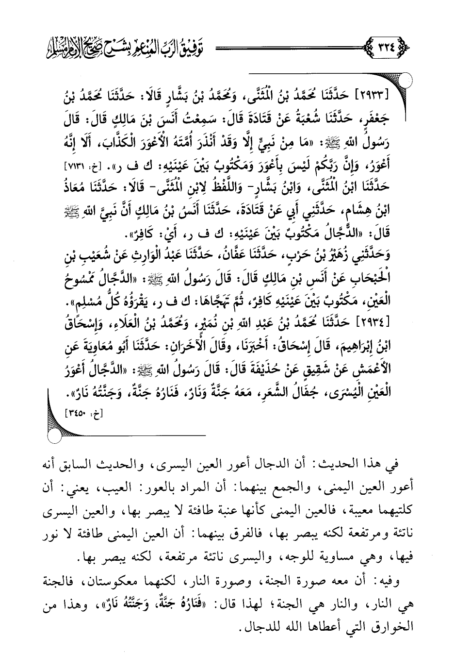 في هذا الحديث: أن الدجال أعور العين اليسرى، والحديث السابق أنه أعور العين اليمنى، والجمع بينهما: أن المراد بالعور: العيب، يعني: أن كلتيهما معيبة، فالعين اليمنى كأنها عنبة طافئة لا يبصر بها، والعين اليسرى ناتئة ومرتفعة لكنه يبصر بها، فالفرق بينهما: أن العين اليمنى طافئة لا نور فيها، وهي مساوية للوجه، واليسرى ناتئة مرتفعة، لكنه يبصر بها.