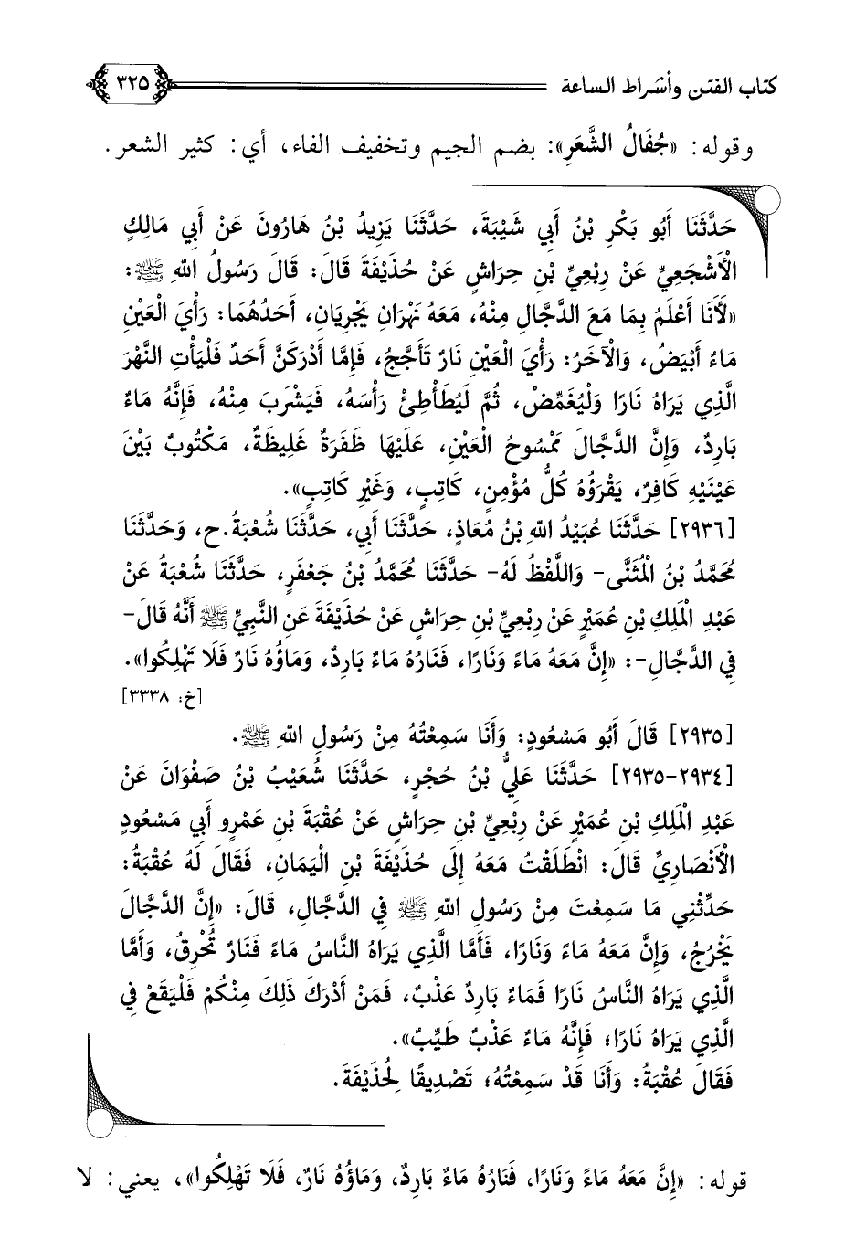 [٢٩٣٤ - ٢٩٣٥] حَدَّثَنَا عَلِيُّ بْنُ حُجْرٍ، حَدَّثَنَا شُعَيْبُ بْنُ صَفْوَانَ عَنْ عَبْدِ الْمَلِكِ بْنِ عُمَيْرٍ عَنْ رِبْعِيِّ بْنِ حِرَاشٍ عَنْ عُقْبَةَ بْنِ عَمْرٍو أَبِي مَسْعُودٍ الْأَنْصَارِيِّ قَالَ: انْطَلَقْتُ مَعَهُ إِلَى حُذَيْفَةَ بْنِ الْيَمَانِ، فَقَالَ لَهُ عُقْبَةُ: حَدِّثْنِي مَا سَمِعْتَ مِنْ رَسُولِ اللَّهِ صلى الله عليه وسلم فِي الدَّجَّالِ، قَالَ: ((إِنَّ الدَّجَّالَ يَخْرُجُ، وَإِنَّ مَعَهُ مَاءً وَنَارًا، فَأَمَّا الَّذِي يَرَاهُ النَّاسُ مَاءً فَنَارٌ تُحْرِقُ، وَأَمَّا الَّذِي يَرَاهُ النَّاسُ نَارًا فَمَاءٌ بَارِدٌ عَذْبٌ، فَمَنْ أَدْرَكَ ذَلِكَ مِنْكُمْ فَلْيَقَعْ فِي الَّذِي يَرَاهُ نَارًا؛ فَإِنَّهُ مَاءٌ عَذْبٌ طَيِّبٌ)).