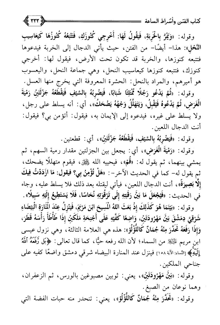 وقوله: ((بَيْنَمَا هُوَ كَذَلِكَ إِذْ بَعَثَ اللَّهُ الْمَسِيحَ ابْنَ مَرْيَمَ، فَيَنْزِلُ عِنْدَ الْمَنَارَةِ الْبَيْضَاءِ شَرْقِيَّ دِمَشْقَ بَيْنَ مَهْرُودَتَيْنِ، وَاضِعًا كَفَّيْهِ عَلَى أَجْنِحَةِ مَلَكَيْنِ إِذَا طَأْطَأَ رَأْسَهُ قَطَرَ، وَإِذَا رَفَعَهُ تَحَدَّرَ مِنْهُ جُمَانٌ كَاللُّؤْلُؤ)): هذه هي العلامة الثالثة، وهي نزول عيسى ابن مريم عليه الصلاة والسلام من السماء؛ لأن الله رفعه حيًّا، كما قال تعالى: {بل رفعه الله إليه} فينزل عند المنارة البيضاء شرقي دمشق واضعًا كفيه على جناحي الملكين.
