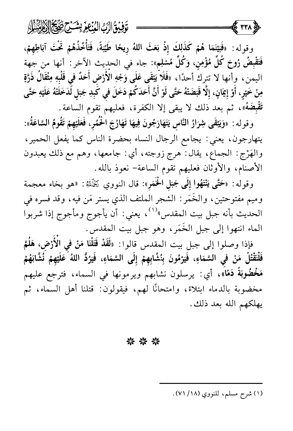 وقوله: ((فَبَيْنَمَا هُمْ كَذَلِكَ إِذْ بَعَثَ اللَّهُ رِيحًا طَيِّبَةً، فَتَأْخُذُهُمْ تَحْتَ آبَاطِهِمْ، فَتَقْبِضُ رُوحَ كُلِّ مُؤْمِنٍ، وَكُلِّ مُسْلِمٍ)): وجاء في الحديث الآخر: أنها من جهة اليمن، وأنها لا تترك أحدًا، ((فَلَا يَبْقَى عَلَى وَجْهِ الْأَرْضِ أَحَدٌ فِي قَلْبِهِ مِثْقَالُ ذَرَّةٍ مِنْ خَيْرٍ، أَوْ إِيمَانٍ، إِلَّا قَبَضَتْهُ حَتَّى لَوْ أَنَّ أَحَدَكُمْ دَخَلَ فِي كَبِدِ جَبَلٍ لَدَخَلَتْهُ عَلَيْهِ حَتَّى تَقْبِضَهُ))، ثم بعد ذلك لا يبقى إلا الكفرة، فعليهم تقوم الساعة.