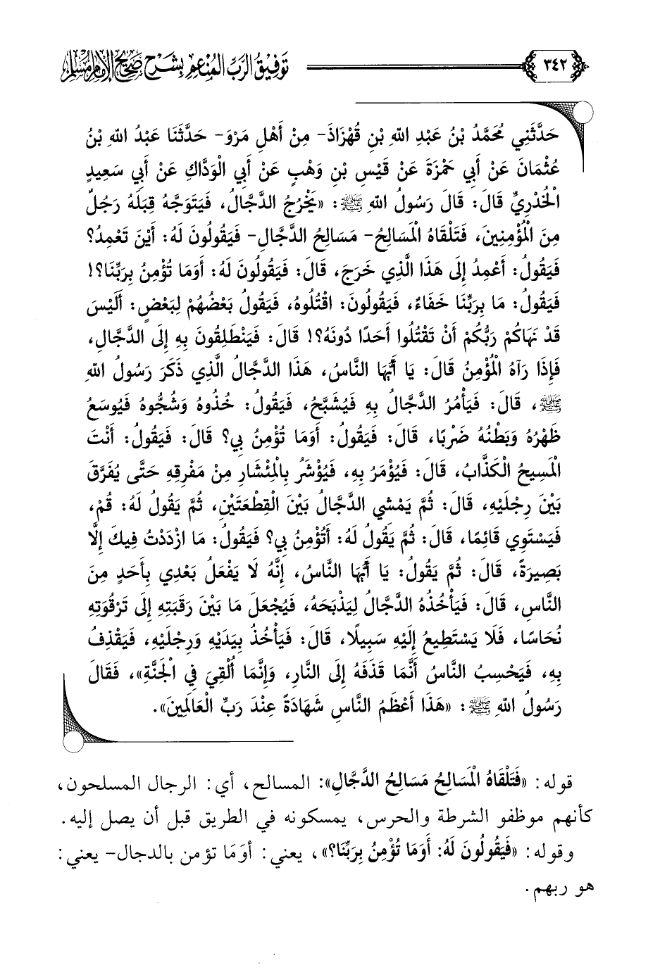 حَدَّثَنِي مُحَمَّدُ بْنُ عَبْدِ اللَّهِ بْنِ قُهْزَاذَ- مِنْ أَهْلِ مَرْوَ- حَدَّثَنَا عَبْدُ اللَّهِ بْنُ عُثْمَانَ عَنْ أَبِي حَمْزَةَ عَنْ قَيْسِ بْنِ وَهْبٍ عَنْ أَبِي الْوَدَّاكِ عَنْ أَبِي سَعِيدٍ الْخُدْرِيِّ قَالَ: قَالَ رَسُولُ اللَّهِ صلى الله عليه وسلم: ((يَخْرُجُ الدَّجَّالُ، فَيَتَوَجَّهُ قِبَلَهُ رَجُلٌ مِنَ الْمُؤْمِنِينَ، فَتَلْقَاهُ الْمَسَالِحُ- مَسَالِحُ الدَّجَّالِ- فَيَقُولُونَ لَهُ: أَيْنَ تَعْمِدُ؟ فَيَقُولُ: أَعْمِدُ إِلَى هَذَا الَّذِي خَرَجَ، قَالَ: فَيَقُولُونَ لَهُ: أَوَمَا تُؤْمِنُ بِرَبِّنَا؟ ! فَيَقُولُ: مَا بِرَبِّنَا خَفَاءٌ، فَيَقُولُونَ: اقْتُلُوهُ، فَيَقُولُ بَعْضُهُمْ لِبَعْضٍ: أَلَيْسَ قَدْ نَهَاكُمْ رَبُّكُمْ أَنْ تَقْتُلُوا أَحَدًا دُونَهُ؟ ! قَالَ: فَيَنْطَلِقُونَ بِهِ إِلَى الدَّجَّالِ، فَإِذَا رَآهُ الْمُؤْمِنُ قَالَ: يَا أَيُّهَا النَّاسُ، هَذَا الدَّجَّالُ الَّذِي ذَكَرَ رَسُولُ اللَّهِ صلى الله عليه وسلم، قَالَ: فَيَأْمُرُ الدَّجَّالُ بِهِ فَيُشَبَّحُ، فَيَقُولُ: خُذُوهُ وَشُجُّوهُ فَيُوسَعُ ظَهْرُهُ وَبَطْنُهُ ضَرْبًا، قَالَ: فَيَقُولُ: أَوَمَا تُؤْمِنُ بِي؟ قَالَ: فَيَقُولُ: أَنْتَ الْمَسِيحُ الْكَذَّابُ، قَالَ: فَيُؤْمَرُ بِهِ، فَيُؤْشَرُ بِالْمِئْشَارِ مِنْ مَفْرِقِهِ حَتَّى يُفَرَّقَ بَيْنَ رِجْلَيْهِ، قَالَ: ثُمَّ يَمْشِي الدَّجَّالُ بَيْنَ الْقِطْعَتَيْنِ، ثُمَّ يَقُولُ لَهُ: قُمْ، فَيَسْتَوِي قَائِمًا، قَالَ: ثُمَّ يَقُولُ لَهُ: أَتُؤْمِنُ بِي؟ فَيَقُولُ: مَا ازْدَدْتُ فِيكَ إِلَّا بَصِيرَةً، قَالَ: ثُمَّ يَقُولُ: يَا أَيُّهَا النَّاسُ، إِنَّهُ لَا يَفْعَلُ بَعْدِي بِأَحَدٍ مِنَ النَّاسِ، قَالَ: فَيَأْخُذُهُ الدَّجَّالُ لِيَذْبَحَهُ، فَيُجْعَلَ مَا بَيْنَ رَقَبَتِهِ إِلَى تَرْقُوَتِهِ نُحَاسًا، فَلَا يَسْتَطِيعُ إِلَيْهِ