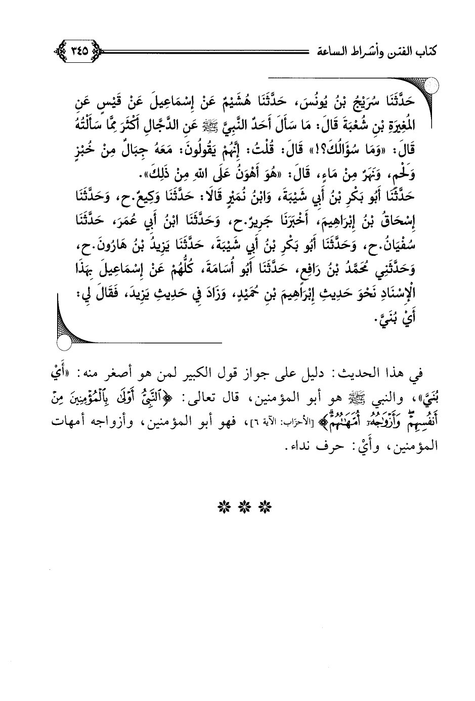 حَدَّثَنَا سُرَيْجُ بْنُ يُونُسَ، حَدَّثَنَا هُشَيْمٌ عَنْ إِسْمَاعِيلَ عَنْ قَيْسٍ عَنِ المُغِيرَةِ بْنِ شُعْبَةَ قَالَ: مَا سَأَلَ أَحَدٌ النَّبِيَّ صلى الله عليه وسلم عَنِ الدَّجَّالِ أَكْثَرَ مِمَّا سَأَلْتُهُ قَالَ: ((وَمَا سُؤَالُكَ؟ ! )) قَالَ: قُلْتُ: إِنَّهُمْ يَقُولُونَ: مَعَهُ جِبَالٌ مِنْ خُبْزٍ وَلَحْمٍ، وَنَهَرٌ مِنْ مَاءٍ، قَالَ: ((هُوَ أَهْوَنُ عَلَى اللَّهِ مِنْ ذَلِكَ)).