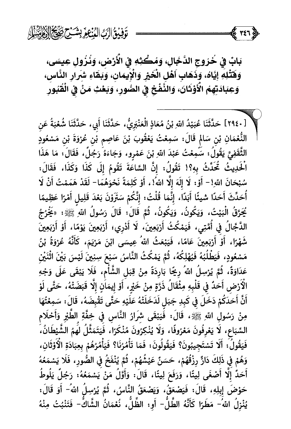 [٢٩٤٠] حَدَّثَنَا عُبَيْدُ اللَّهِ بْنُ مُعَاذٍ الْعَنْبَرِيُّ، حَدَّثَنَا أَبِي، حَدَّثَنَا شُعْبَةُ عَنِ النُّعْمَانِ بْنِ سَالِمٍ قَالَ: سَمِعْتُ يَعْقُوبَ بْنَ عَاصِمِ بْنِ عُرْوَةَ بْنِ مَسْعُودٍ الثَّقَفِيَّ يَقُولُ: سَمِعْتُ عَبْدَ اللَّهِ بْنَ عَمْرٍو، وَجَاءَهُ رَجُلٌ، فَقَالَ: مَا هَذَا الْحَدِيثُ تُحَدِّثُ بِهِ؟ ! تَقُولُ: إِنَّ السَّاعَةَ تَقُومُ إِلَى كَذَا وَكَذَا، فَقَالَ: سُبْحَانَ اللَّهِ! - أَوْ: لَا إِلَهَ إِلَّا اللَّهُ! ، أَوْ كَلِمَةً نَحْوَهُمَا- لَقَدْ هَمَمْتُ أَنْ لَا أُحَدِّثَ أَحَدًا شيئًا أَبَدًا، إِنَّمَا قُلْتُ: إِنَّكُمْ سَتَرَوْنَ بَعْدَ قَلِيلٍ أَمْرًا عَظِيمًا يُحَرَّقُ الْبَيْتُ، وَيَكُونُ، وَيَكُونُ، ثُمَّ قَالَ: قَالَ رَسُولُ اللَّهِ صلى الله عليه وسلم: ((يَخْرُجُ الدَّجَّالُ فِي أُمَّتِي، فَيَمْكُثُ أَرْبَعِينَ، لَا أَدْرِي؛ أَرْبَعِينَ يَوْمًا، أَوْ أَرْبَعِينَ شَهْرًا، أَوْ أَرْبَعِينَ عَامًا، فَيَبْعَثُ اللَّهُ عِيسَى ابْنَ مَرْيَمَ، كَأَنَّهُ عُرْوَةُ بْنُ مَسْعُودٍ، فَيَطْلُبُهُ فَيُهْلِكُهُ، ثُمَّ يَمْكُثُ النَّاسُ سَبْعَ سِنِينَ لَيْسَ بَيْنَ اثْنَيْنِ عَدَاوَةٌ، ثُمَّ يُرْسِلُ اللَّهُ رِيحًا بَارِدَةً مِنْ قِبَلِ الشَّأْمِ، فَلَا يَبْقَى عَلَى وَجْهِ الْأَرْضِ أَحَدٌ فِي قَلْبِهِ مِثْقَالُ ذَرَّةٍ مِنْ خَيْرٍ، أَوْ إِيمَانٍ إِلَّا قَبَضَتْهُ، حَتَّى لَوْ أَنَّ أَحَدَكُمْ دَخَلَ فِي كَبِدِ جَبَلٍ لَدَخَلَتْهُ عَلَيْهِ حَتَّى تَقْبِضَهُ، قَالَ: سَمِعْتُهَا مِنْ رَسُولِ اللَّهِ صلى الله عليه وسلم، قَالَ: فَيَبْقَى شِرَارُ النَّاسِ فِي خِفَّةِ الطَّيْرِ وَأَحْلَامِ السِّبَاعِ، لَا يَعْرِفُونَ مَعْرُوفًا، وَلَا يُنْكِرُونَ مُنْكَرًا، فَيَتَمَثَّلُ لَهُمُ الشَّيْطَانُ، فَيَقُولُ: أَلَا تَسْتَجِيبُونَ؟ فَيَقُولُونَ: فَمَا تَأْمُرُنَا؟