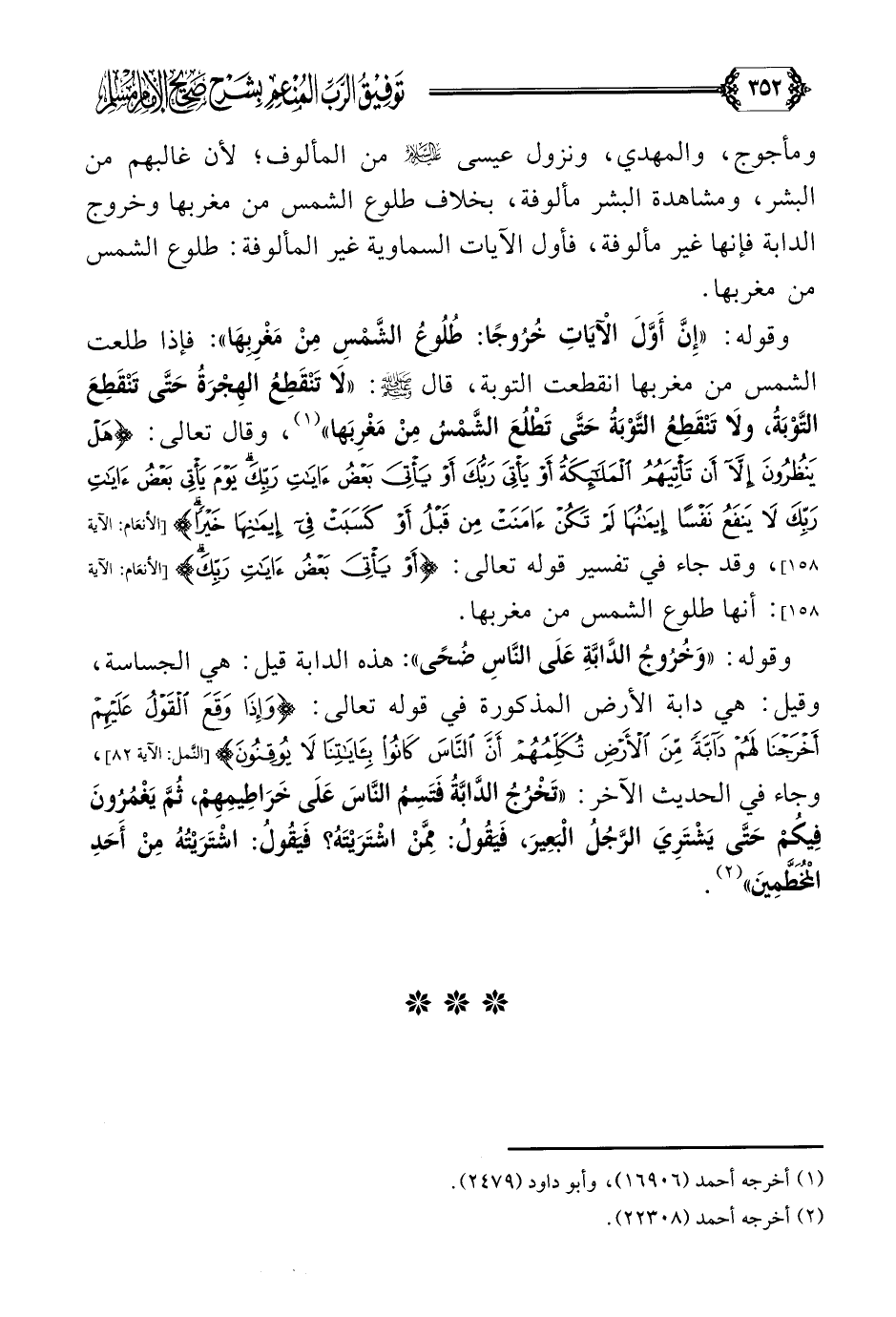ومأجوج، والمهدي، ونزول عيسى عليه السلام من المألوف؛ لأن غالبهم من البشر، ومشاهدة البشر مألوفة، بخلاف طلوع الشمس من مغربها وخروج الدابة فإنها غير مألوفة، فأول الآيات السماوية غير المألوفة: طلوع الشمس من مغربها.