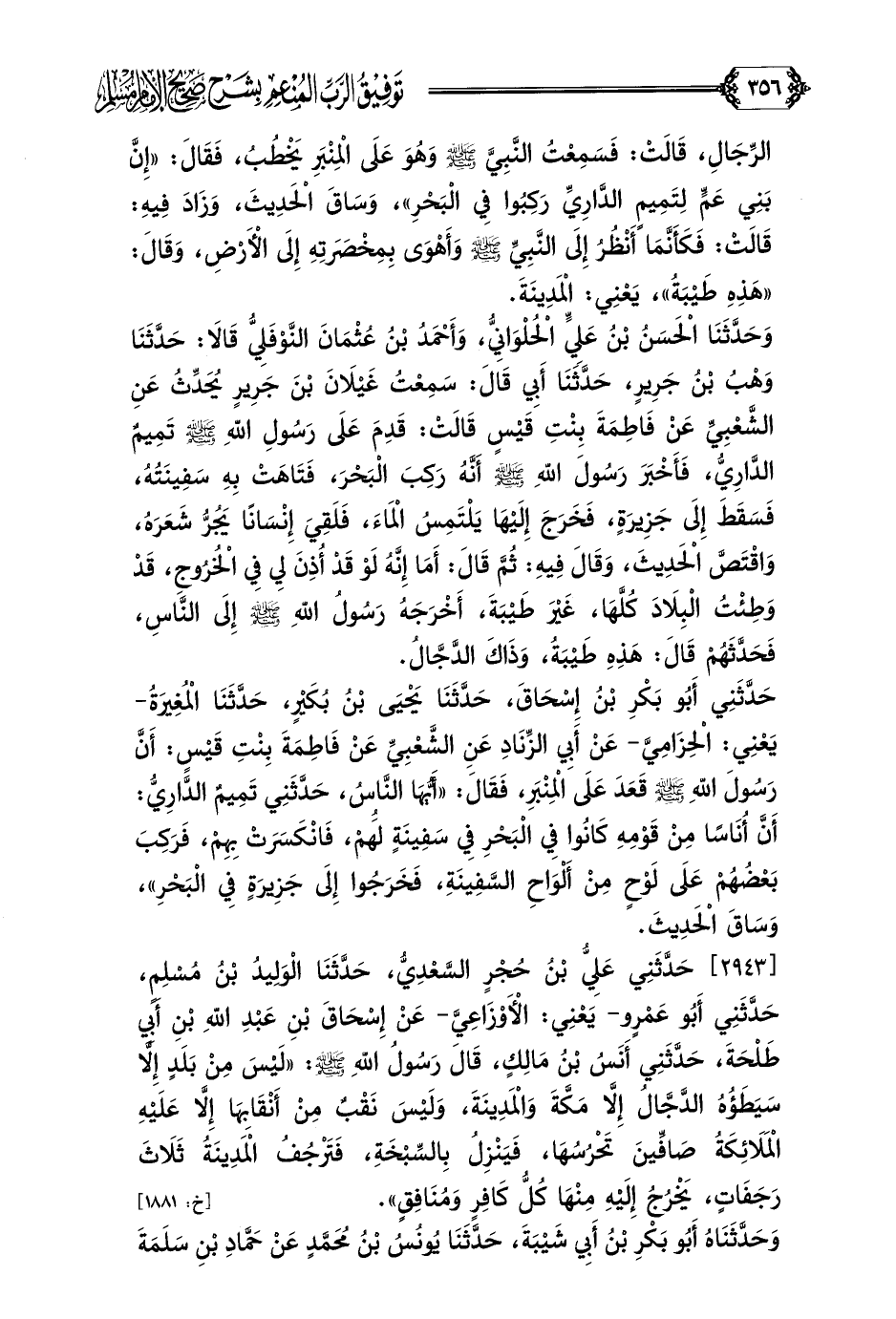 حَدَّثَنِي أَبُو بَكْرِ بْنُ إِسْحَاقَ، حَدَّثَنَا يَحْيَى بْنُ بُكَيْرٍ، حَدَّثَنَا الْمُغِيرَةُ- يَعْنِي: الْحِزَامِيَّ- عَنْ أَبِي الزِّنَادِ عَنِ الشَّعْبِيِّ عَنْ فَاطِمَةَ بِنْتِ قَيْسٍ: أَنَّ رَسُولَ اللَّهِ صلى الله عليه وسلم قَعَدَ عَلَى الْمِنْبَرِ، فَقَالَ: ((أَيُّهَا النَّاسُ، حَدَّثَنِي تَمِيمٌ الدَّارِيُّ: أَنَّ أُنَاسًا مِنْ قَوْمِهِ كَانُوا فِي الْبَحْرِ فِي سَفِينَةٍ لَهُمْ، فَانْكَسَرَتْ بِهِمْ، فَرَكِبَ بَعْضُهُمْ عَلَى لَوْحٍ مِنْ أَلْوَاحِ السَّفِينَةِ، فَخَرَجُوا إِلَى جَزِيرَةٍ فِي الْبَحْرِ))، وَسَاقَ الْحَدِيثَ.
