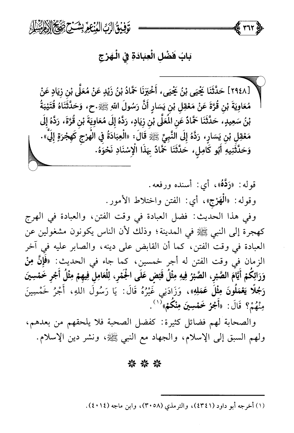 [٢٩٤٨] حَدَّثَنَا يَحْيَى بْنُ يَحْيَى، أَخْبَرَنَا حَمَّادُ بْنُ زَيْدٍ عَنْ مُعَلَّى بْنِ زِيَادٍ عَنْ مُعَاوِيَةَ بْنِ قُرَّةَ عَنْ مَعْقِلِ بْنِ يَسَارٍ أَنَّ رَسُولَ اللَّهِ صلى الله عليه وسلم. ح، وَحَدَّثَنَاهُ قُتَيْبَةُ بْنُ سَعِيدٍ، حَدَّثَنَا حَمَّادٌ عَنِ المُعَلَّى بْنِ زِيَادٍ، رَدَّهُ إِلَى مُعَاوِيَةَ بْنِ قُرَّةَ، رَدَّهُ إِلَى مَعْقِلِ بْنِ يَسَارٍ، رَدَّهُ إِلَى النَّبِيِّ صلى الله عليه وسلم قَالَ: ((الْعِبَادَةُ فِي الْهَرْجِ كَهِجْرَةٍ إِلَيَّ)).