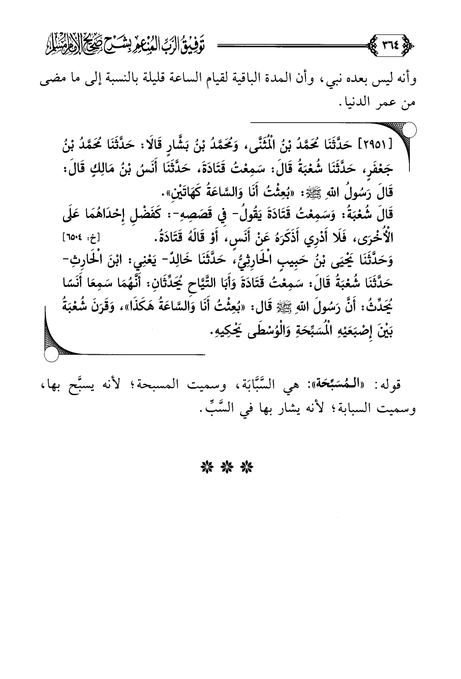 [٢٩٥١] حَدَّثَنَا مُحَمَّدُ بْنُ الْمُثَنَّى، وَمُحَمَّدُ بْنُ بَشَّارٍ قَالَا: حَدَّثَنَا مُحَمَّدُ بْنُ جَعْفَرٍ، حَدَّثَنَا شُعْبَةُ قَالَ: سَمِعْتُ قَتَادَةَ، حَدَّثَنَا أَنَسُ بْنُ مَالِكٍ قَالَ: قَالَ رَسُولُ اللَّهِ صلى الله عليه وسلم: ((بُعِثْتُ أَنَا وَالسَّاعَةُ كَهَاتَيْنِ)).