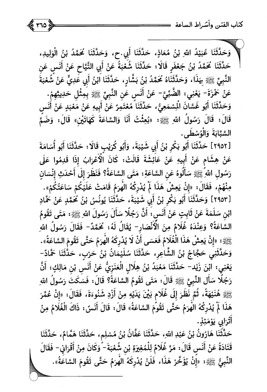 وَحَدَّثَنِي حَجَّاجُ بْنُ الشَّاعِرِ، حَدَّثَنَا سُلَيْمَانُ بْنُ حَرْبٍ، حَدَّثَنَا حَمَّادٌ- يَعْنِي: ابْنَ زَيْد- حَدَّثَنَا مَعْبَدُ بْنُ هِلَالٍ الْعَنَزِيُّ عَنْ أَنَسِ بْنِ مَالِكٍ: أَنَّ رَجُلًا سَأَل النَّبِيَّ صلى الله عليه وسلم قَالَ: مَتَى تَقُومُ السَّاعَةُ؟ قَالَ: فَسَكَتَ رَسُولُ اللَّهِ صلى الله عليه وسلم هُنَيْهَةً، ثُمَّ نَظَرَ إِلَى غُلَامٍ بَيْنَ يَدَيْهِ مِنْ أَزْدِ شَنُوءَةَ، فَقَالَ: ((إِنْ عُمِّرَ هَذَا لَمْ يُدْرِكْهُ الْهَرَمُ حَتَّى تَقُومَ السَّاعَةُ)) قَالَ: قَالَ أَنَسٌ: ذَاكَ الْغُلَامُ مِنْ أَتْرَابِي يَوْمَئِذٍ.